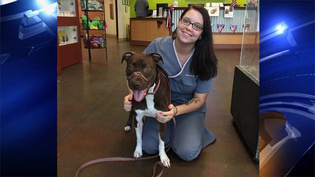 Caitlyn, a stray 15-month-old chocolate Staffordshire mix, showed up at a home in June with her mouth tightly bound with black electrical tape.