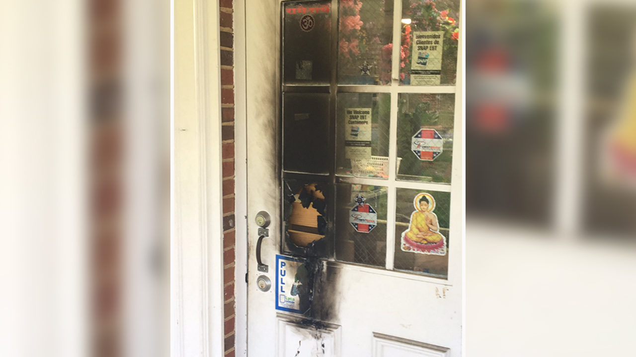 The fire was under control by the time firefighters and police arrived, but officers noticed one of the door’s window panes had been smashed.