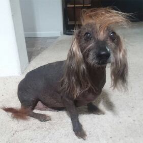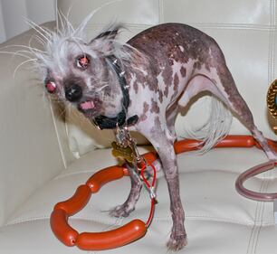 2018 World’s Ugliest Dog contestant Himisaboo: Himisaboo’s mom was a Chinese Crested Hairless mix and his dad was a red headed wiener dog, owners say. Except for the famous hair on his head, and that on my tail and toes, he is hairless.