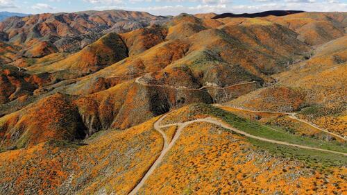 An aerial view of a super bloom of wildflowers in the hills of Walker Canyon on March 12, 2019 near Lake Elsinore, California. Heavy winter rains in California led to a super bloom in various places around the state. Photo: Mario Tama/Getty Images