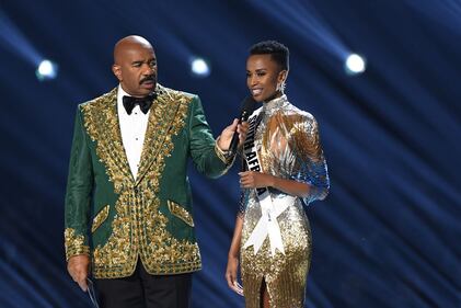 Steve Harvey and Miss South Africa ZozibiniTunzi speak onstage at the 2019 Miss Universe Pageant at Tyler Perry Studios on December 08, 2019 in Atlanta, Georgia. (Paras Griffin/Getty Images)