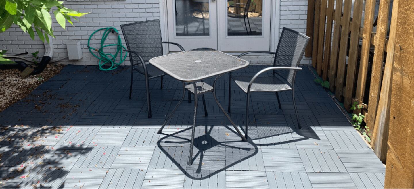 Clark purchased a pack of linkable outdoor tiles to place over the existing pavement to see if it would actually make the patio look better.