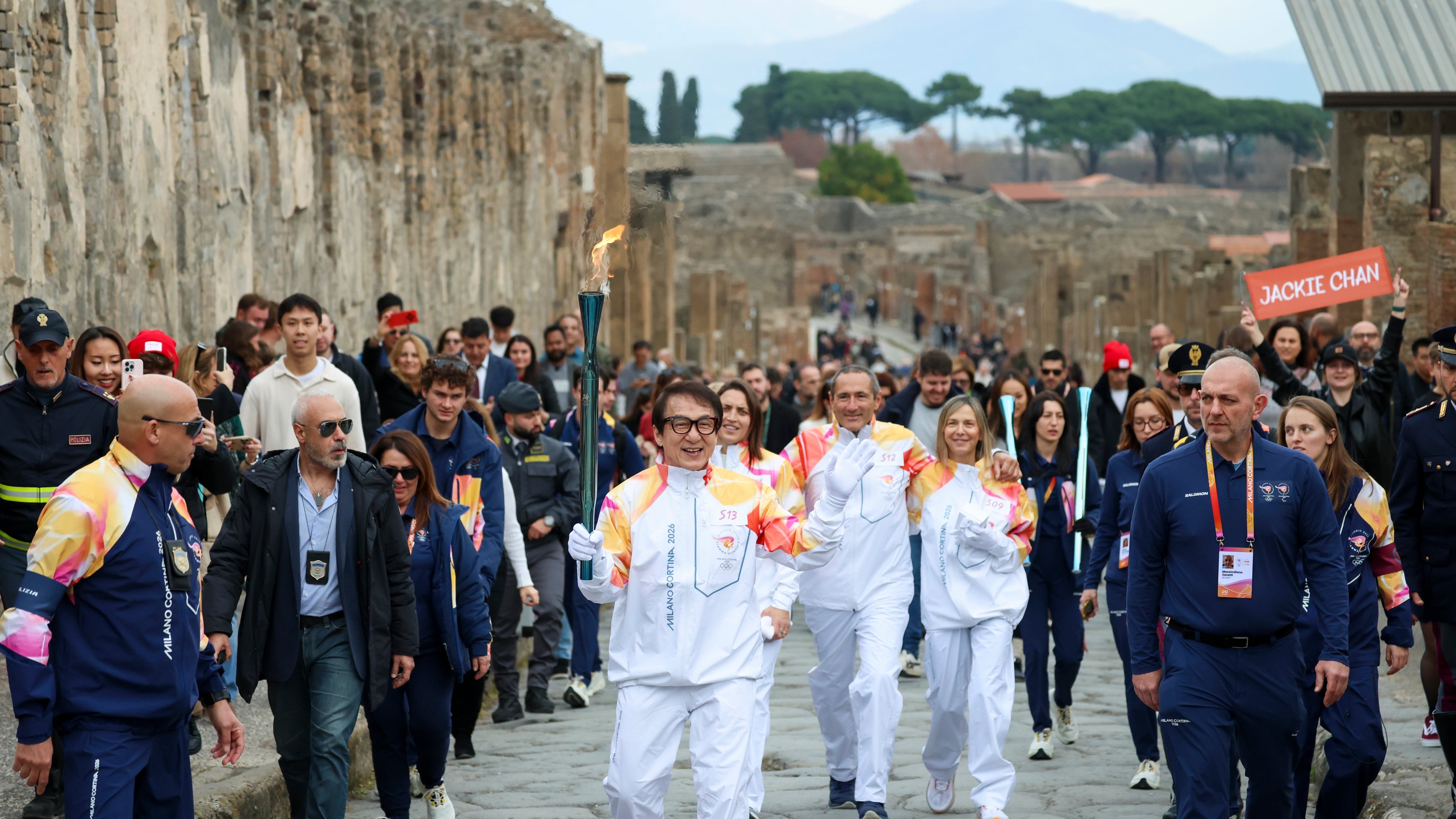 POMPEII, Italy — Actor Jackie Chan carried the Olympic torch through the ruins of Pompeii during the relay for the Milan Cortina Winter Games on Monday.