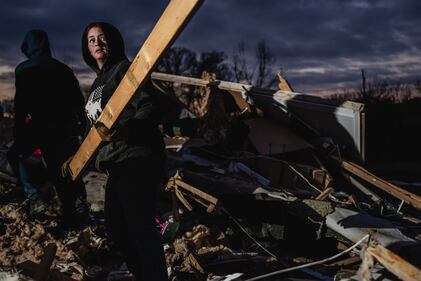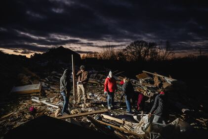 Storms rip through Tennessee: Residents and visitors work to clear debris in search of pets and belongings of a destroyed home in the aftermath of a tornado on Dec. 10, 2023, in Clarksville, Tennessee. (Jon Cherry/Getty Images)