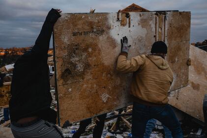 Storms rip through Tennessee: A resident of Clarksville, Tennessee, lifts a board to add to a pile in search of pets and belongings of a destroyed home in the aftermath of a tornado on Dec. 10, 2023. (Jon Cherry/Getty Images)
