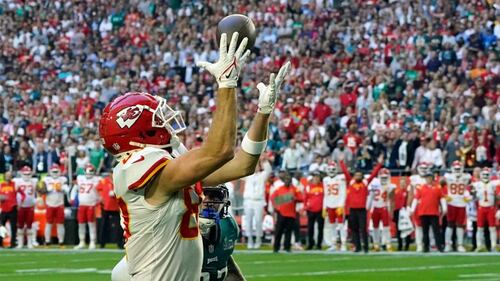 Super Bowl LVII: Kansas City Chiefs' tight end Travis Kelce stretches to catch an 18-yard touchdown pass in the first quarter. (Timothy A. Clary/AFP via Getty Images)