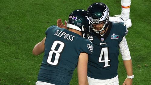 Super Bowl LVII: Eagles kicker Jake Elliott (4) is congratulated by teammate Arryn Siposs after his 35-yard field goal as time ran out in the first half. ( Rob Carr/Getty Images)