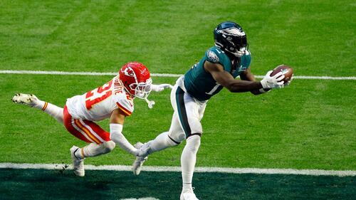 Super Bowl LVII: Philadelphia's A.J. Brown, right, hauls in a 45-yard touchdown pass from Jalen Hurts on the first play of the second quarter. (Sarah Stier/Getty Images)