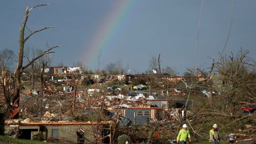 Tornado causes damage in Arkansas LITTLE ROCK, AR - MARCH 31: A rainbow shines amidst the remains of a neighborhood damaged by a tornado on March 31, 2023 in Little Rock, Arkansas. Tornados damaged hundreds of homes and buildings Friday afternoon across a large part of Central Arkansas. Governor Sarah Huckabee Sanders declared a state of emergency after the catastrophic storms that hit on Friday afternoon. According to local reports, the storms killed at least three people. (Photo by Benjamin Krain/Getty Images) (Benjamin Krain/Getty Images)