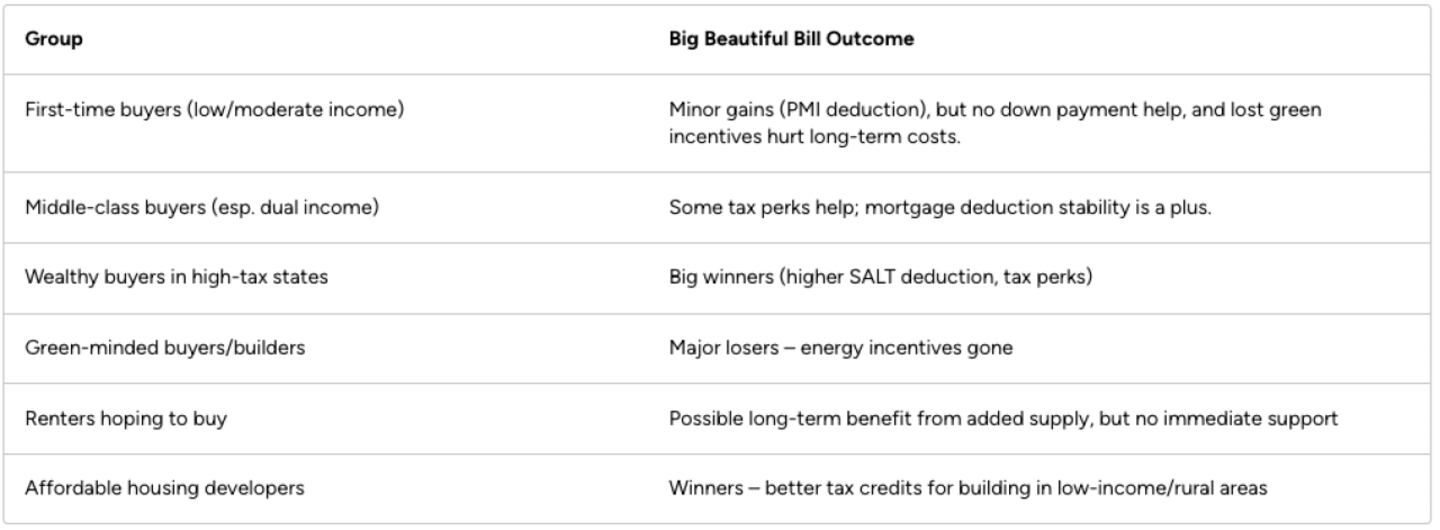 The Big Beautiful Bill may help some homebuyers — especially middle- and upper-income earners, tipped workers, and investors in high-tax areas. But it does little to directly support affordability or sustainability, and it eliminates programs that benefit first-time and energy-conscious buyers.