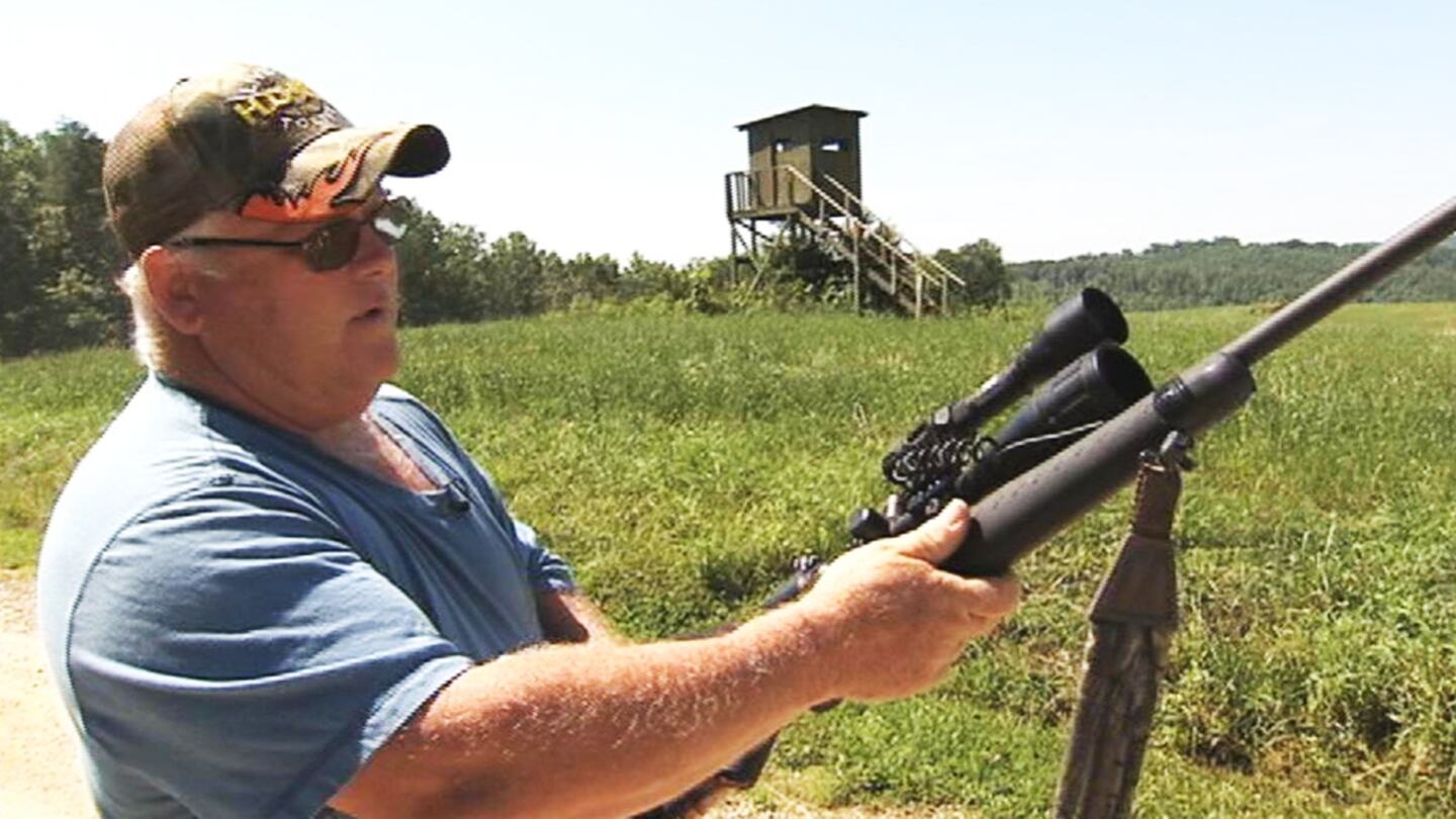 Randy Huffman, who lives on a chicken farm south of Morganton, has a rifle he uses to hunt coyotes.