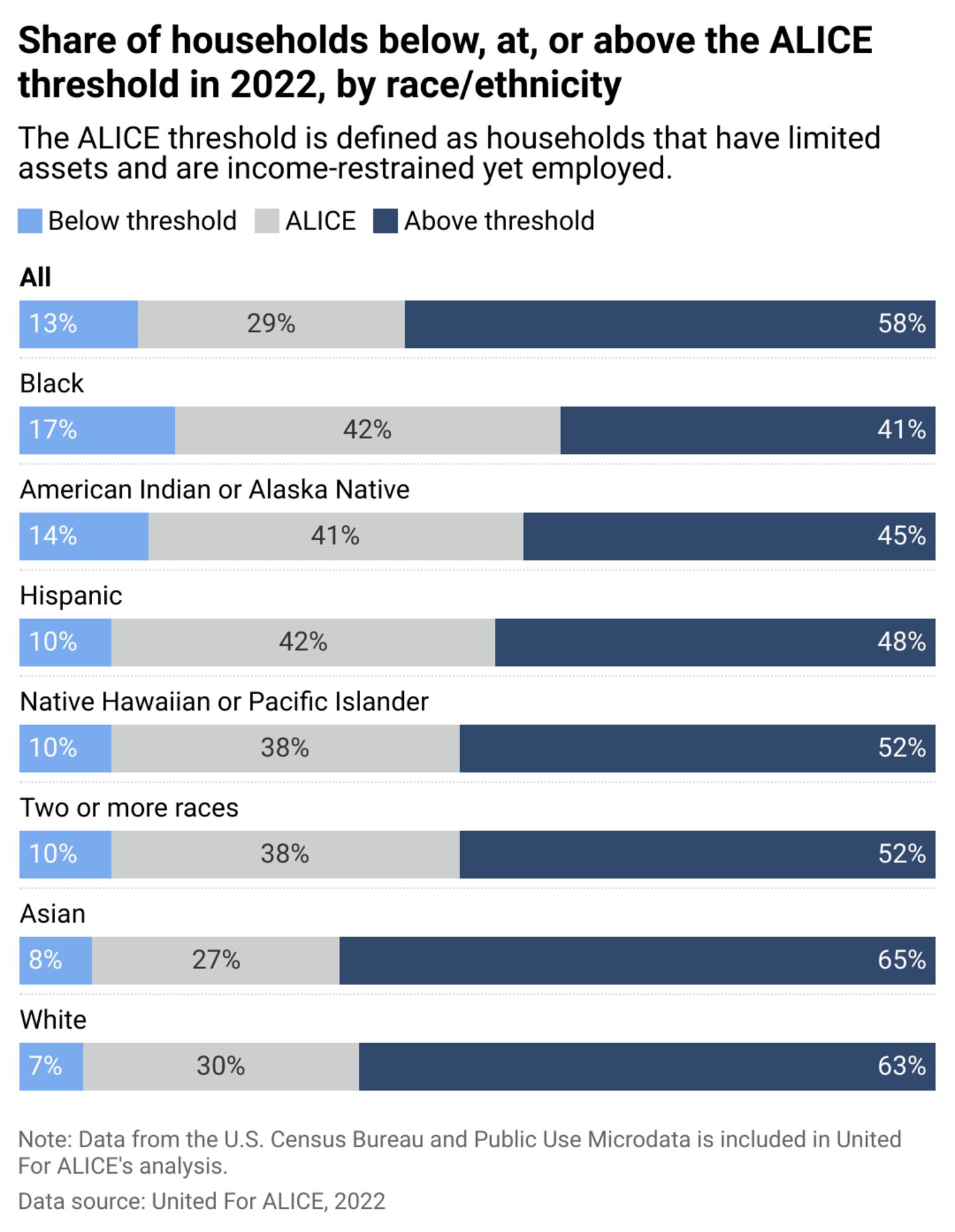 Census Bureau data shows that ALICE thresholds vary by location, with housing and child care costs pushing more families into financial precarity. However, about 29% of U.S. households fall under the ALICE description. Without savings or assets to fall back on, these households remain at high risk for long-term economic hardship.