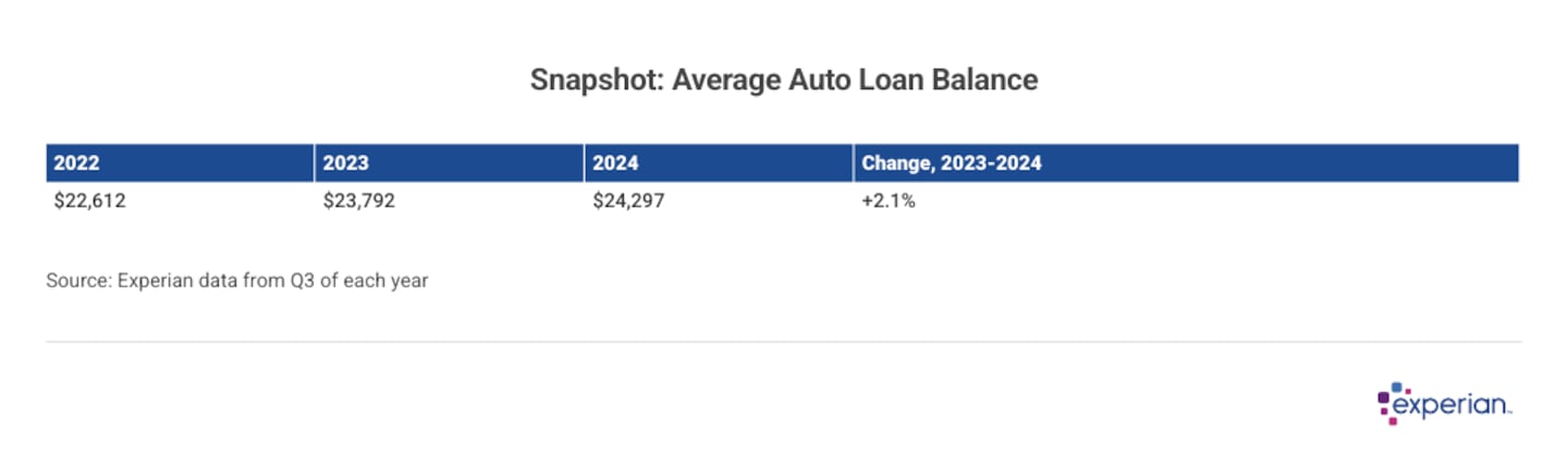 The average auto loan balance held by consumers in the United States increased 2.1% to $24,297 as of the third quarter (Q3) of 2024, according to Experian data. This increase broadly impacted all U.S. regions and consumers of all ages and incomes intending to finance new and used vehicles. The average balance grew less than it did in 2023.