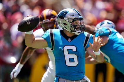 Carolina Panthers vs Washington Commanders Carolina Panthers quarterback Baker Mayfield throws a pass during the first half of a NFL preseason football game against the Washington Commanders, Saturday, Aug. 13, 2022, in Landover, Md. (AP Photo/Alex Brandon) (Alex Brandon/AP)