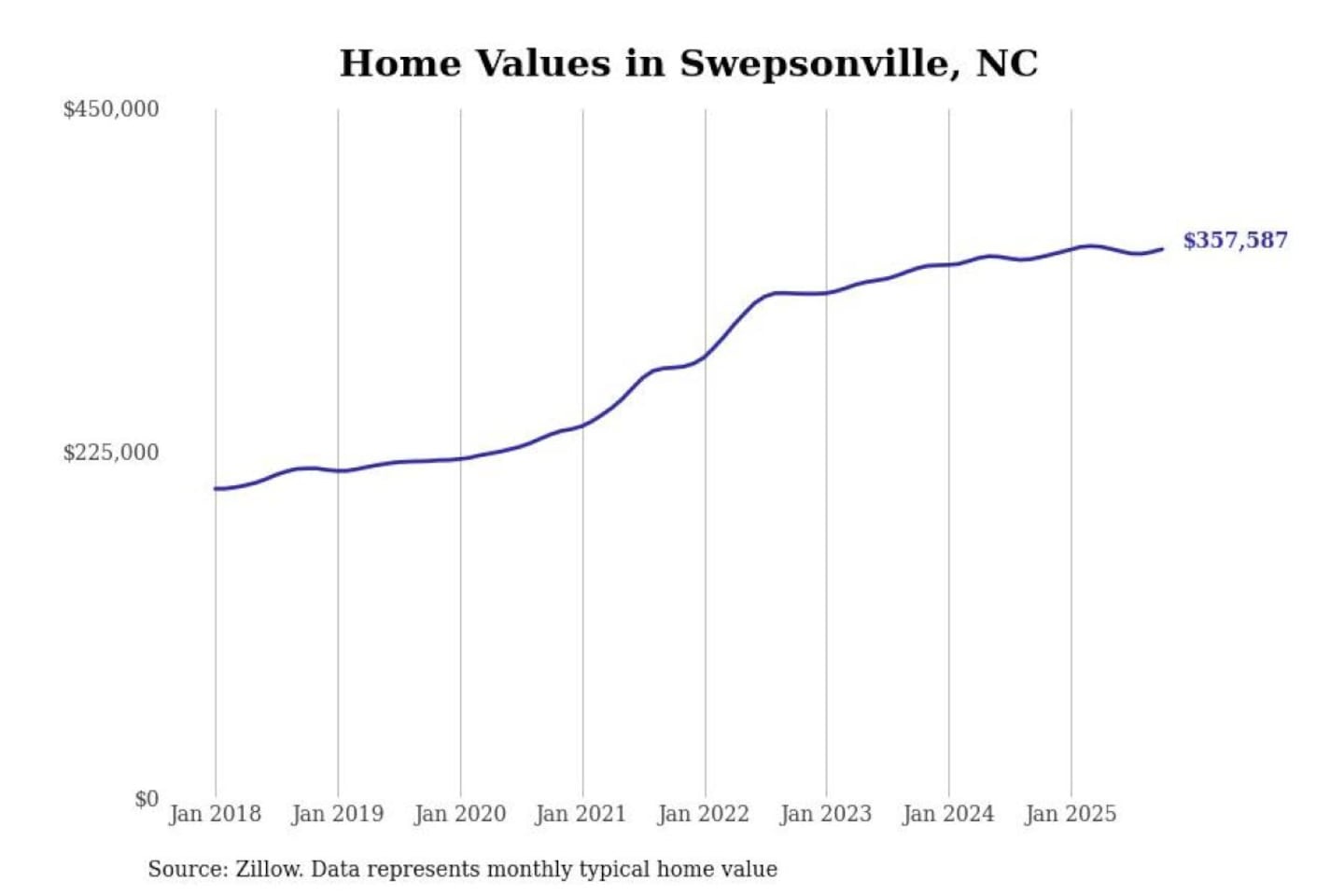 Stacker compiled a list of cities with the most expensive homes in the Burlington, NC metro area using data from Zillow. Charts show the monthly typical home value since January 2018.