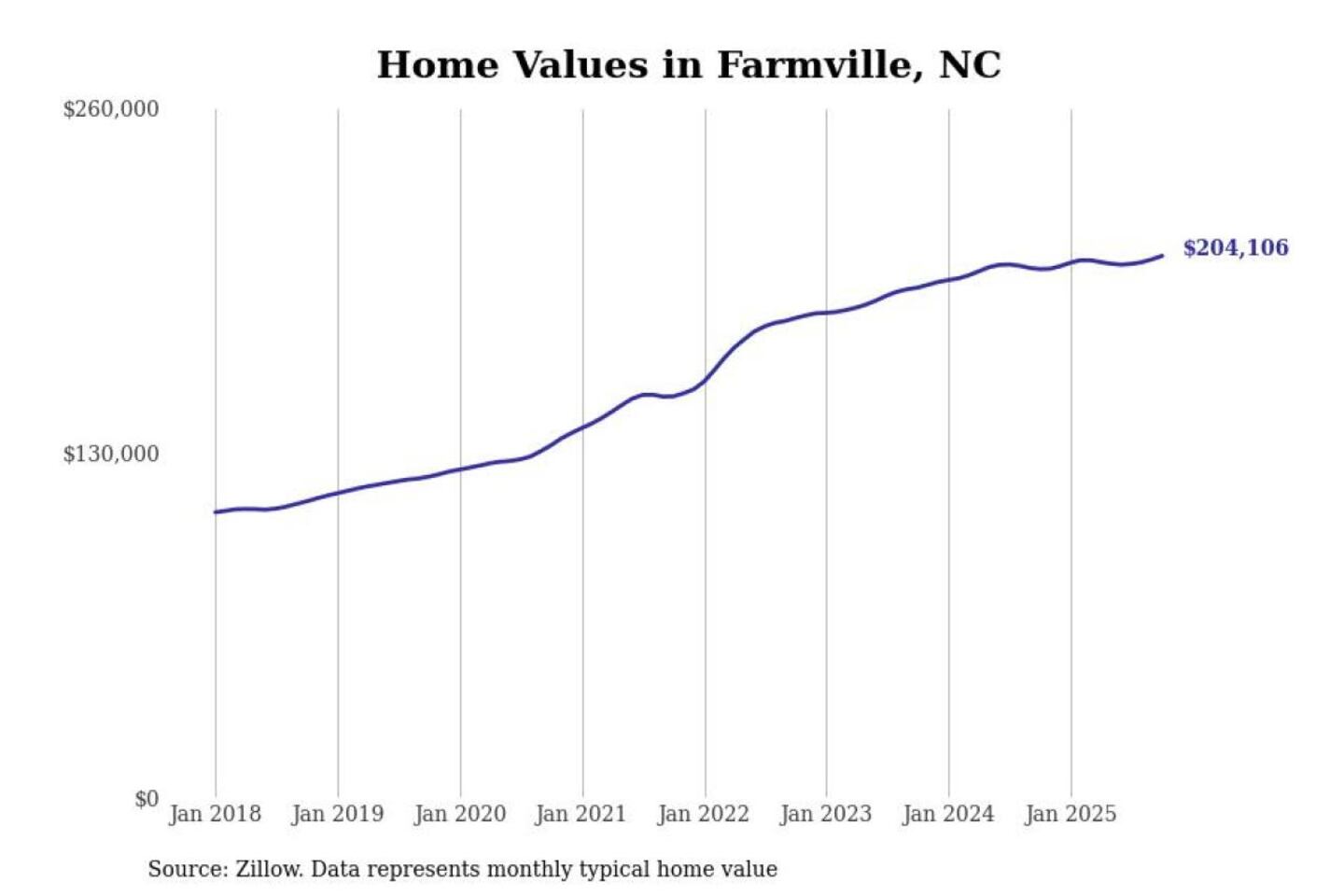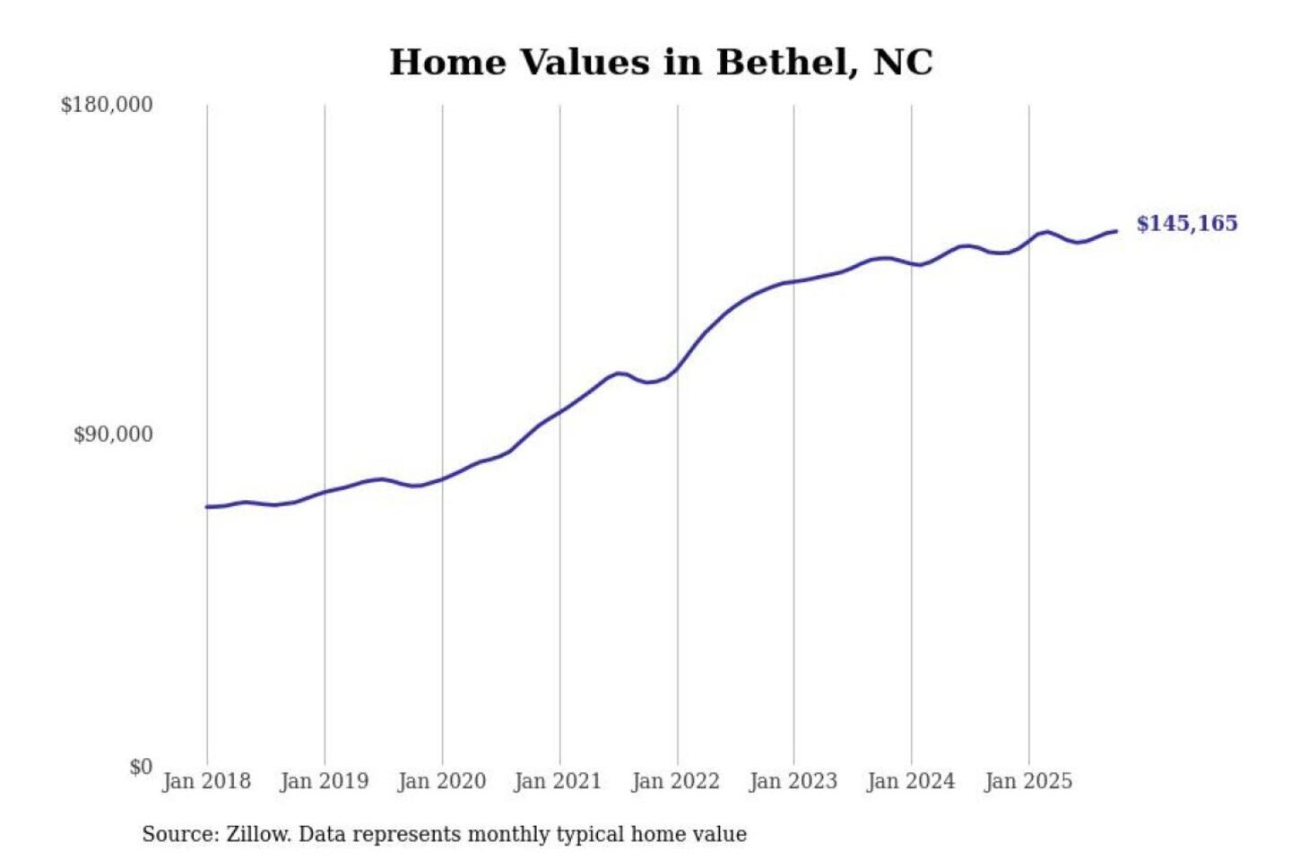Stacker compiled a list of cities with the most expensive homes in the Greenville, NC metro area using data from Zillow. Charts show the monthly typical home value since January 2018.