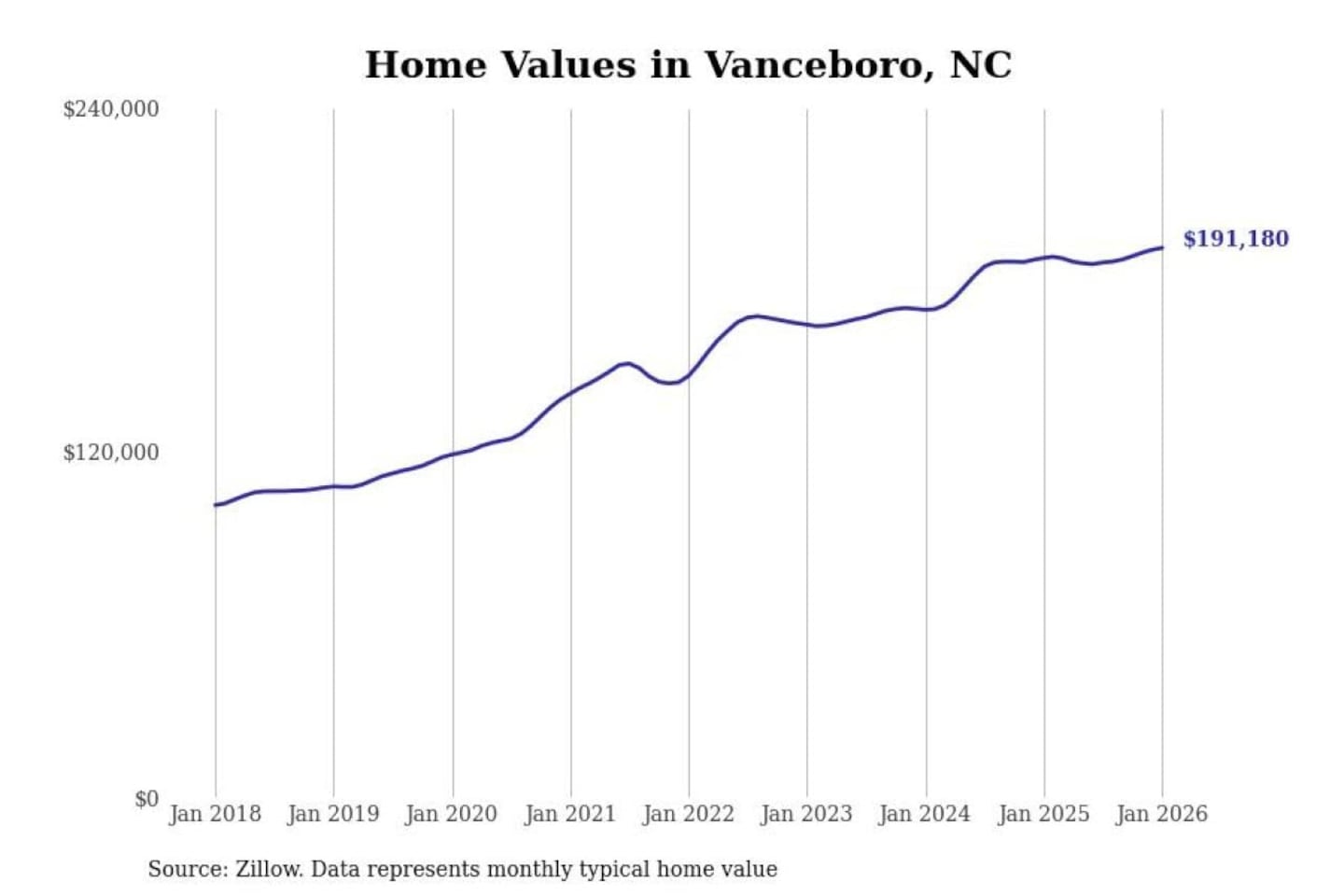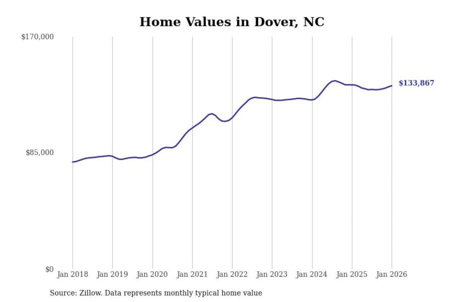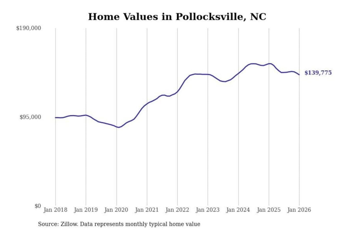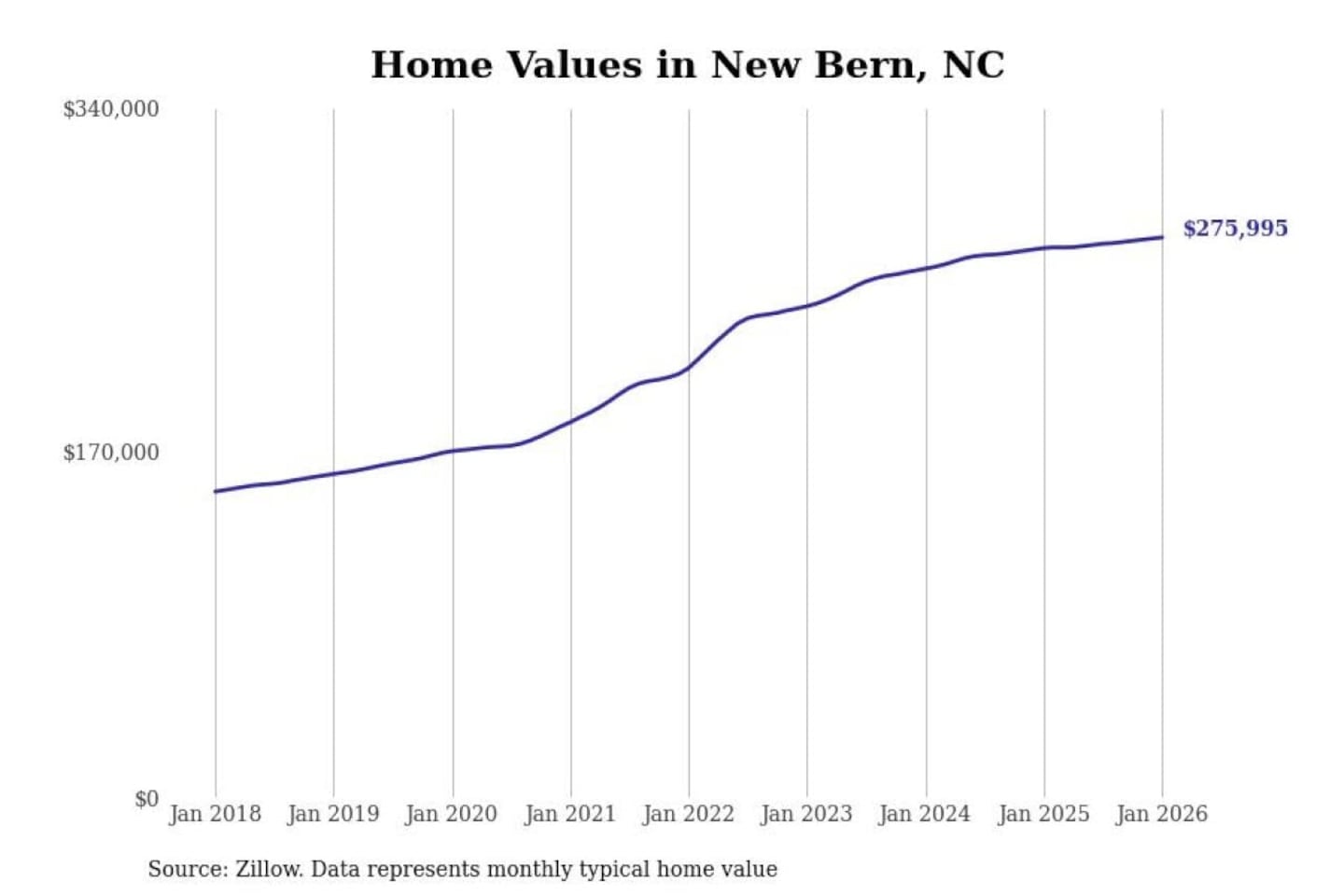 Stacker compiled a list of cities with the most expensive homes in the New Bern, NC metro area using data from Zillow. Charts show the monthly typical home value since January 2018.