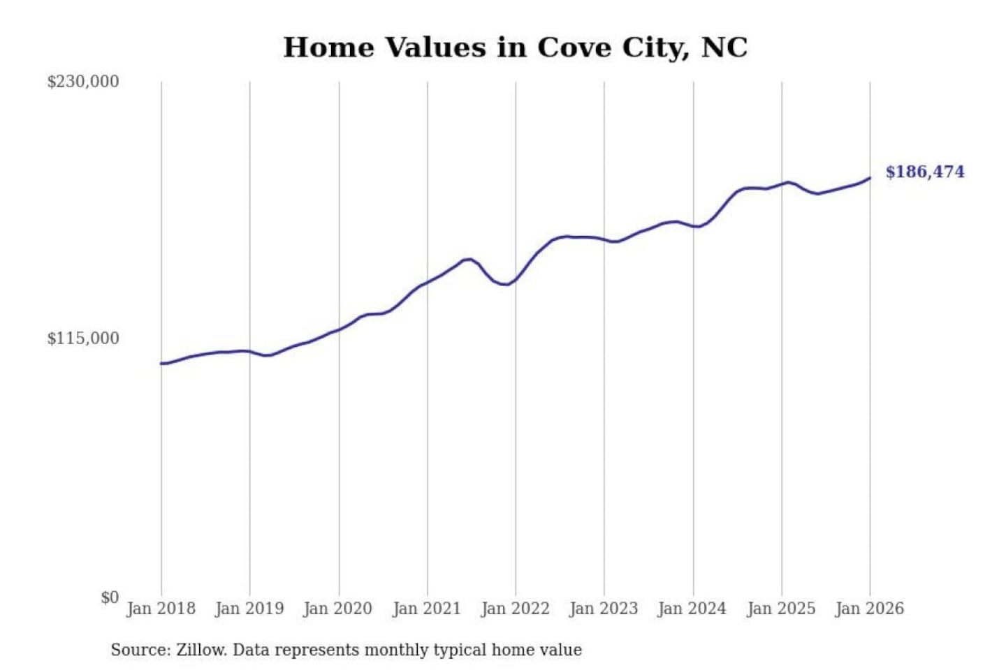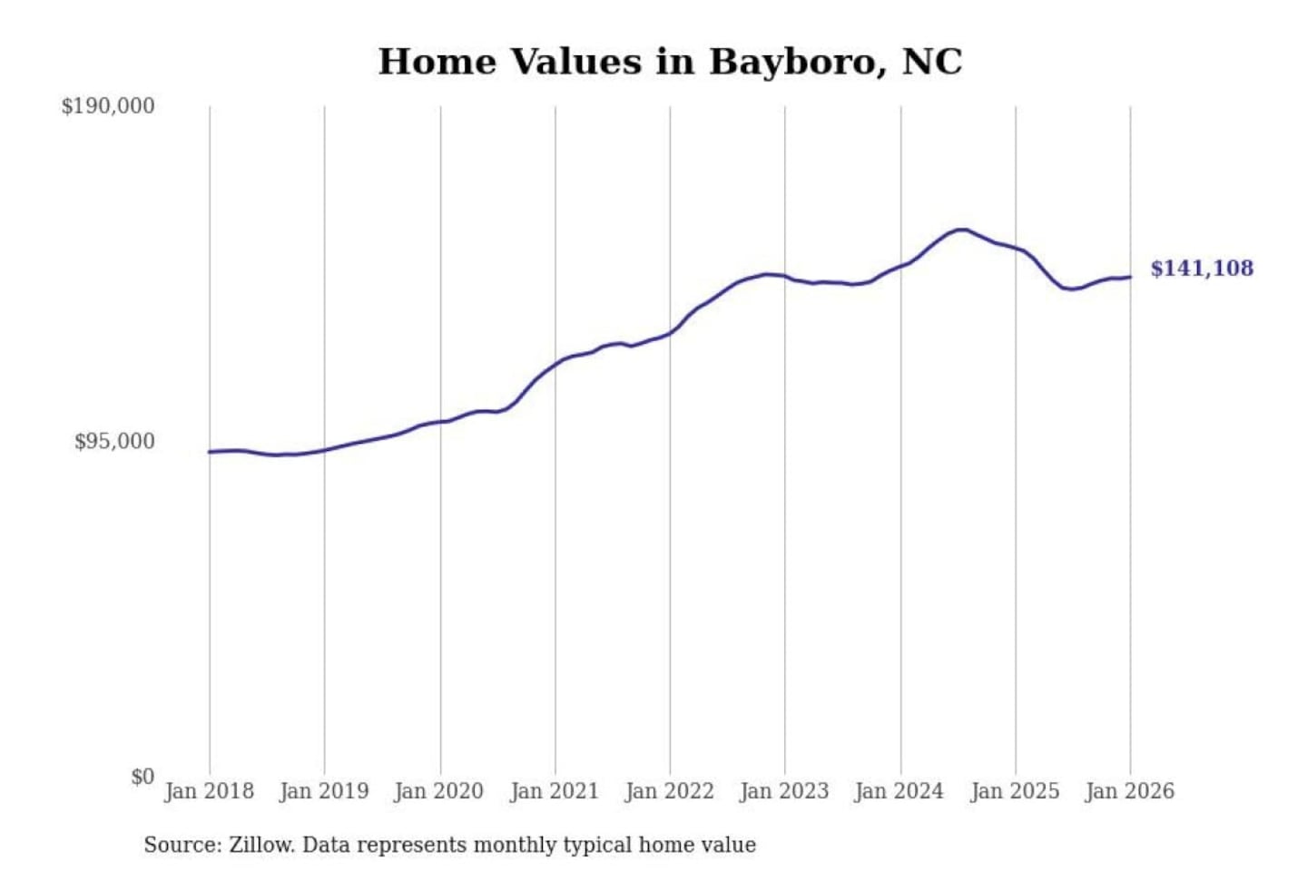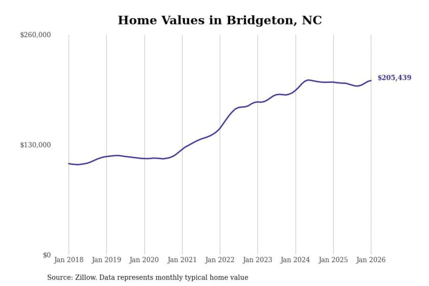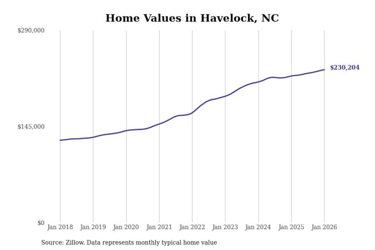 Stacker compiled a list of cities with the most expensive homes in the New Bern, NC metro area using data from Zillow. Charts show the monthly typical home value since January 2018.