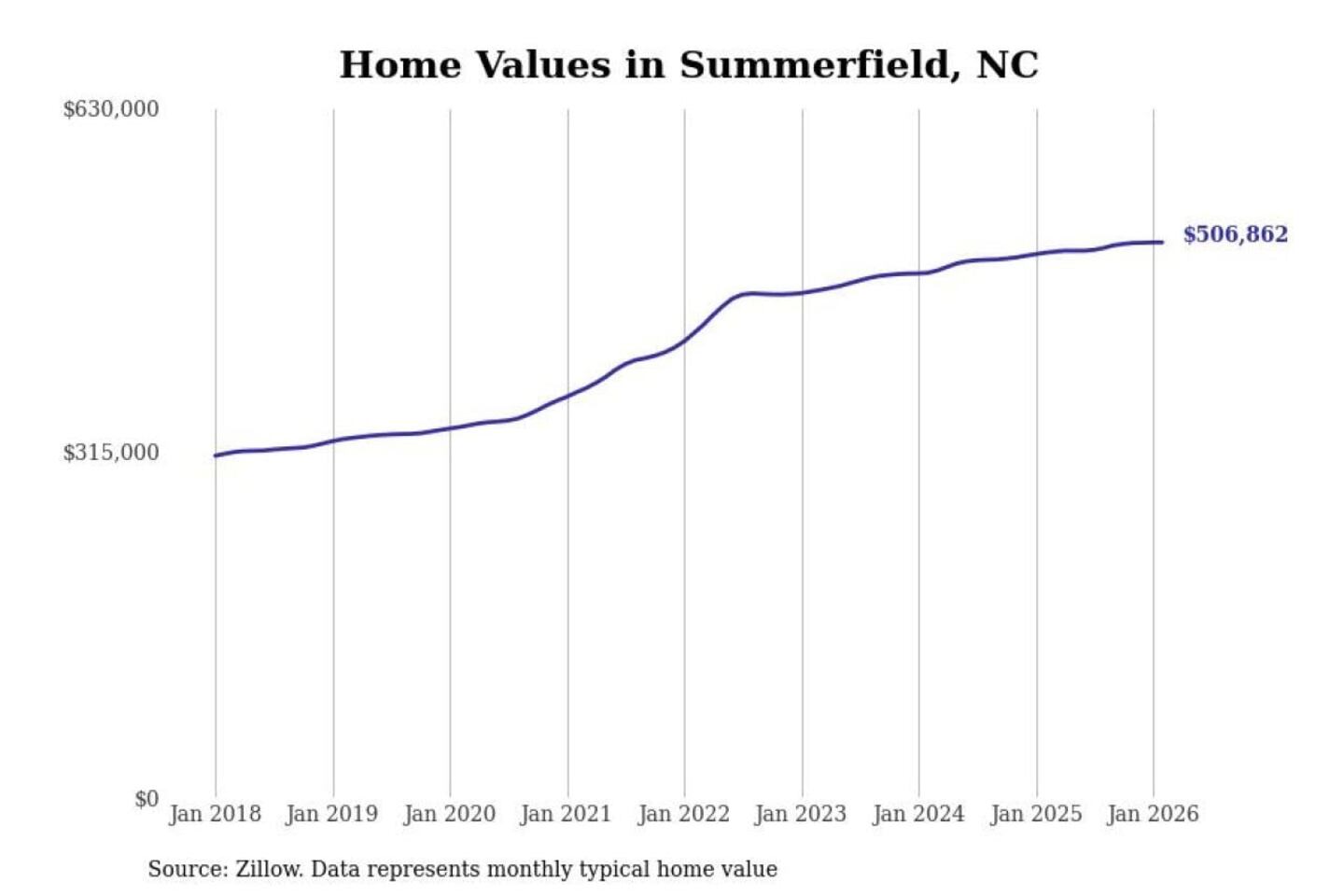 Stacker compiled a list of cities with the most expensive homes in the Greensboro-High Point, NC metro area using data from Zillow. Charts show the monthly typical home value since January 2018.