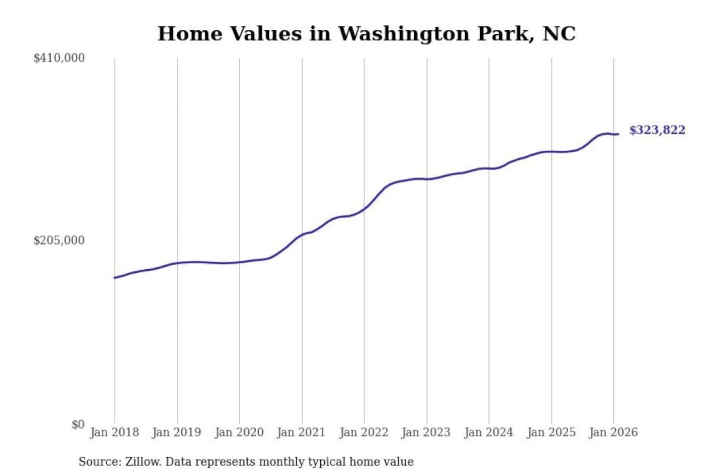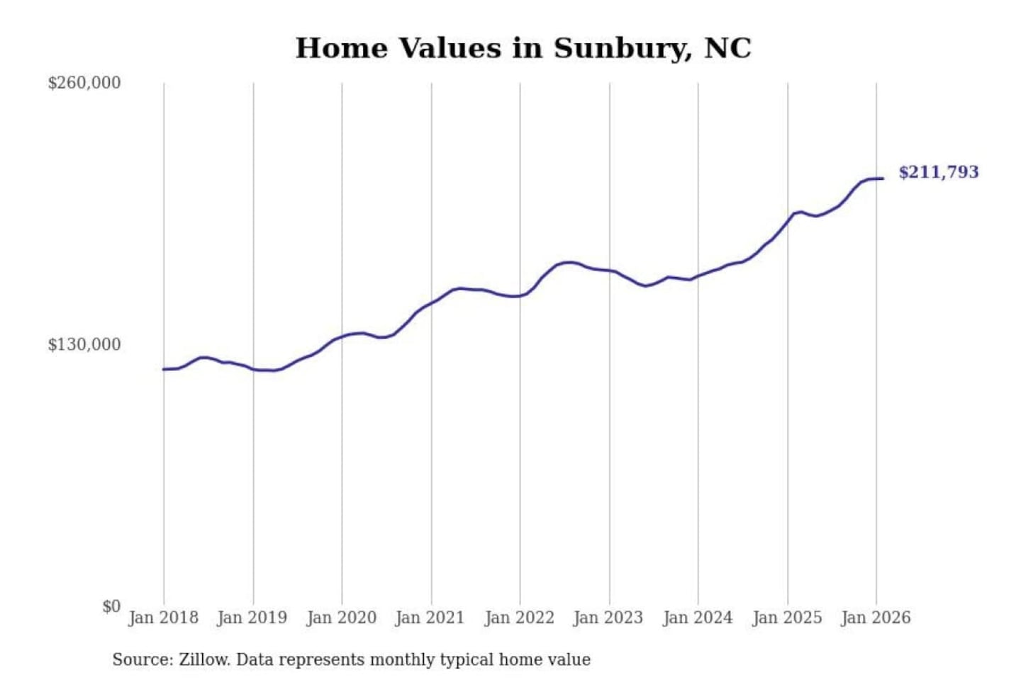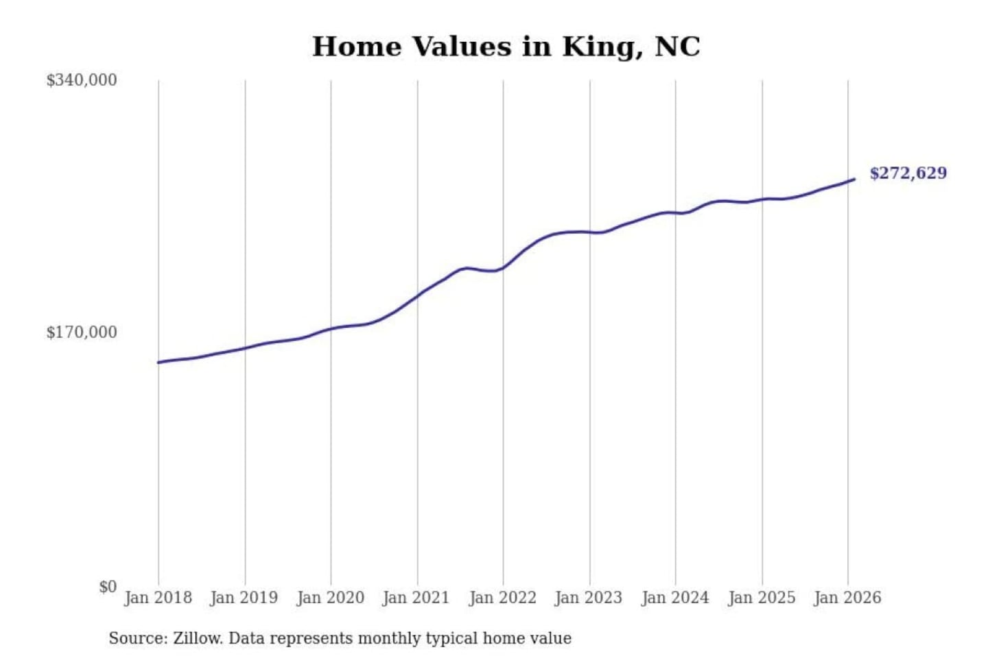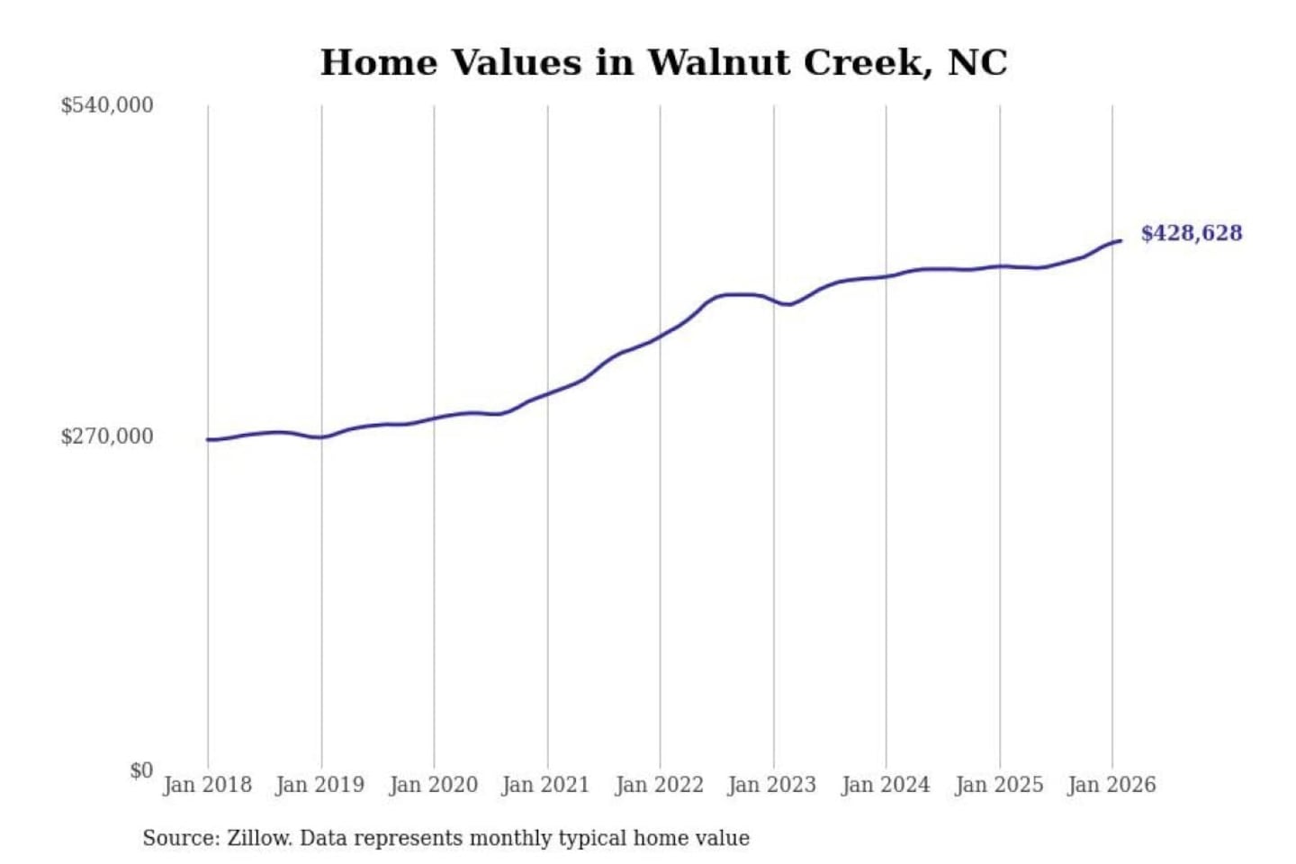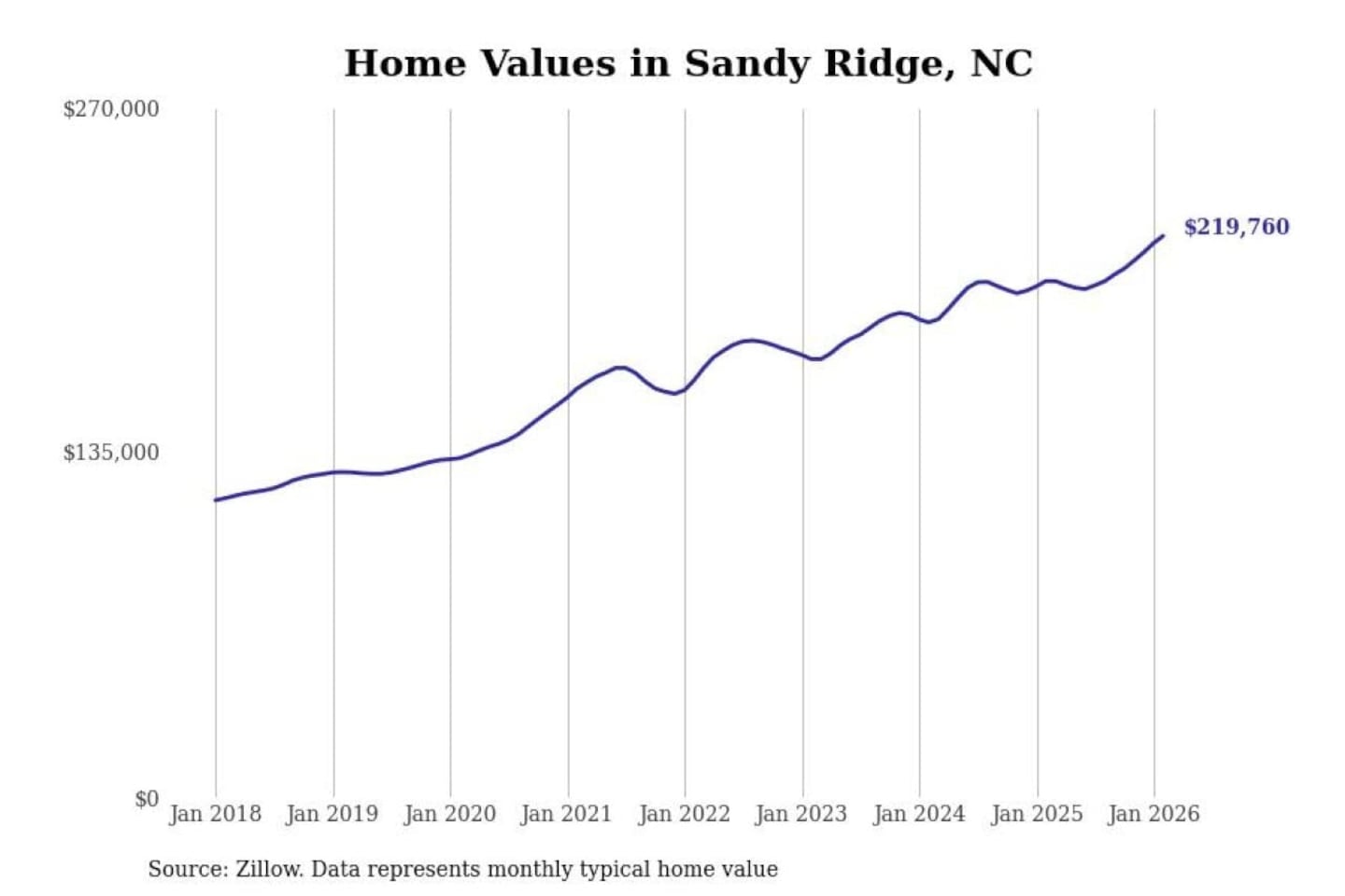 Stacker compiled a list of cities with the fastest-growing home prices in North Carolina using data from Zillow. Cities are ranked by the dollar change in the Zillow Home Values Index for all homes from the 12 months ending February 2026. The charts in this story were created automatically using Matplotlib. Data was available for 50 cities and towns in North Carolina.