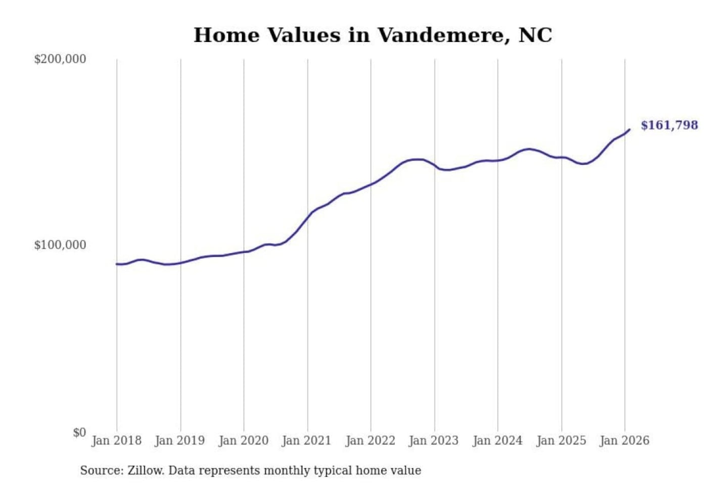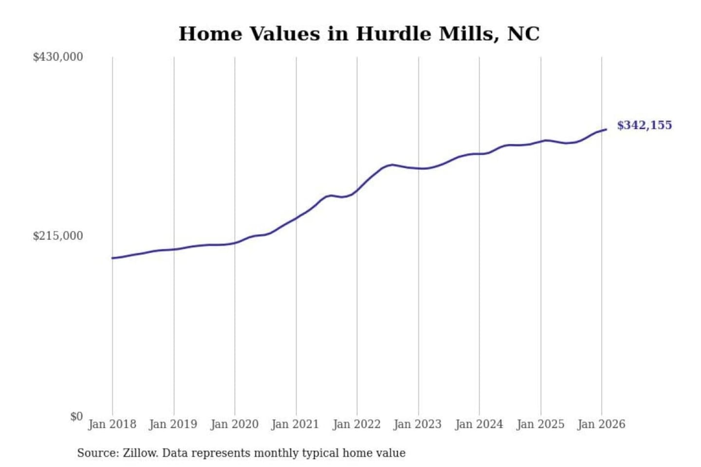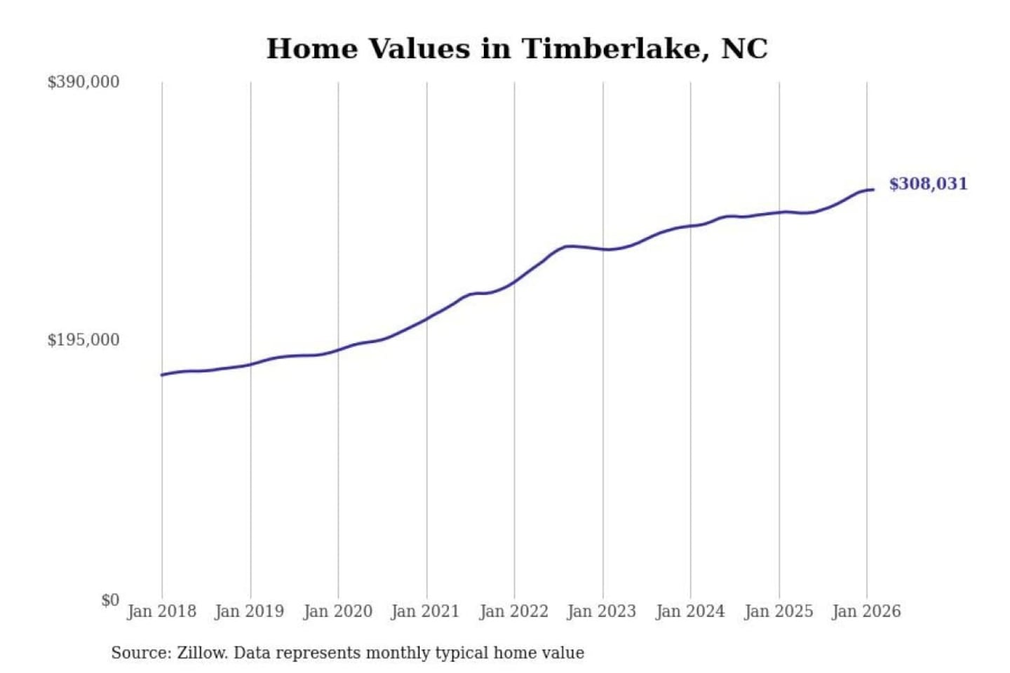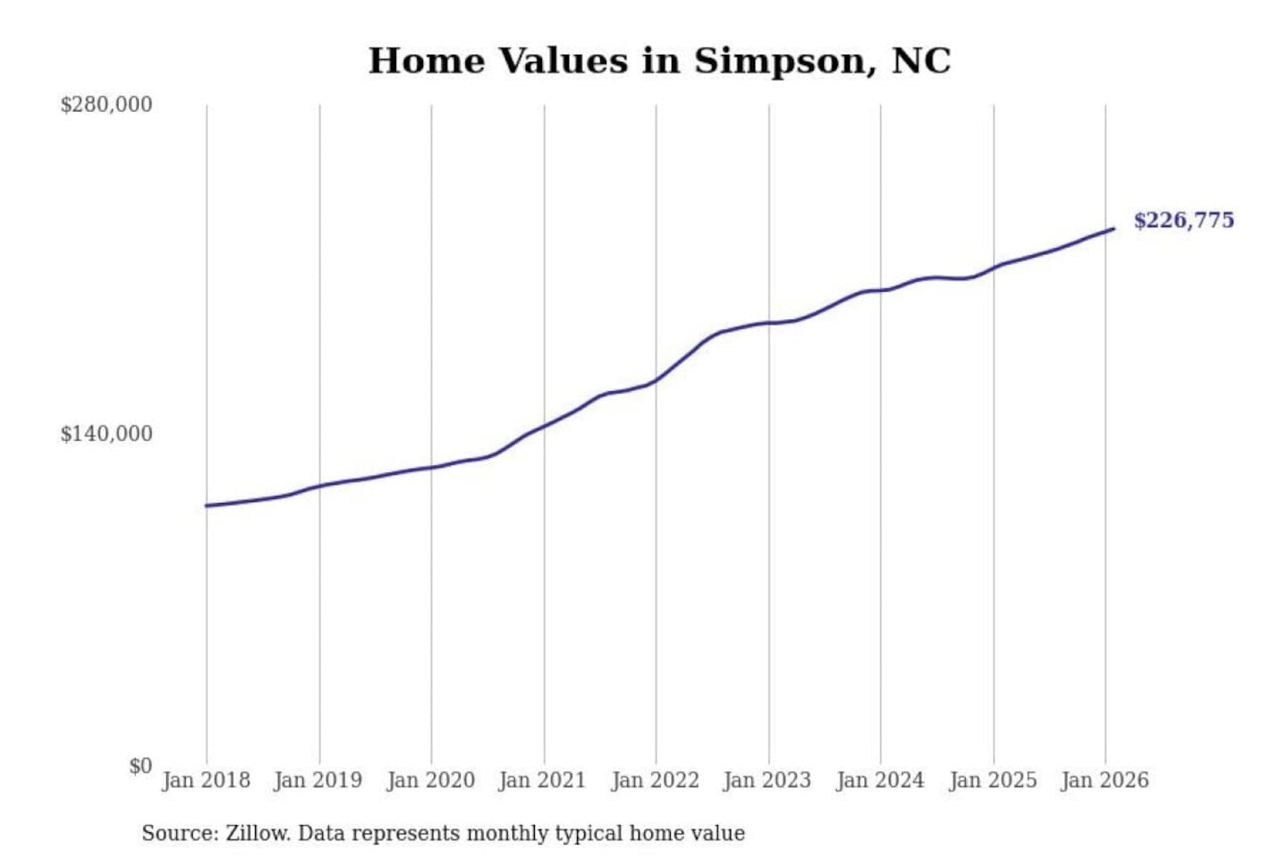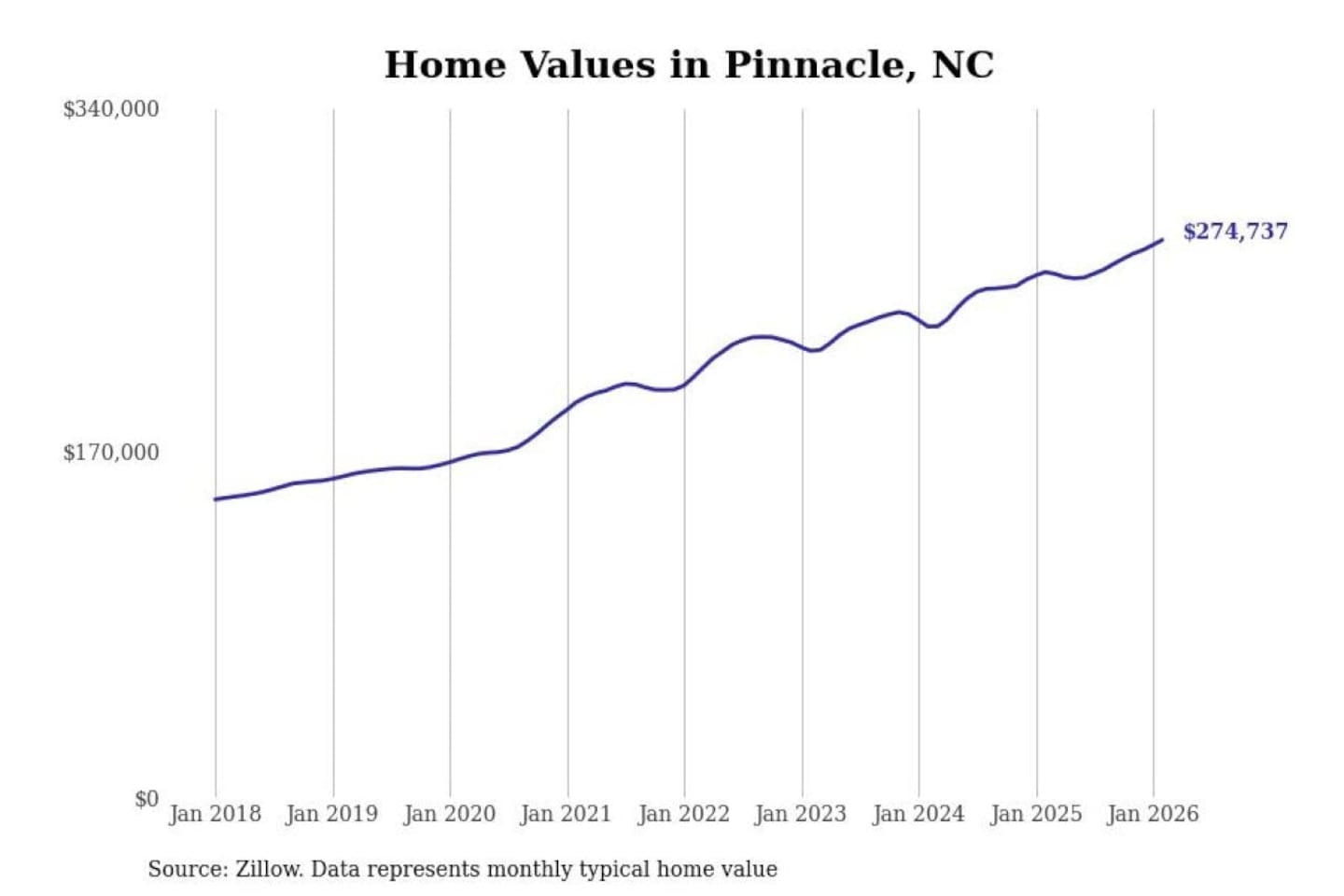 Stacker compiled a list of cities with the fastest-growing home prices in North Carolina using data from Zillow. Cities are ranked by the dollar change in the Zillow Home Values Index for all homes from the 12 months ending February 2026. The charts in this story were created automatically using Matplotlib. Data was available for 50 cities and towns in North Carolina.