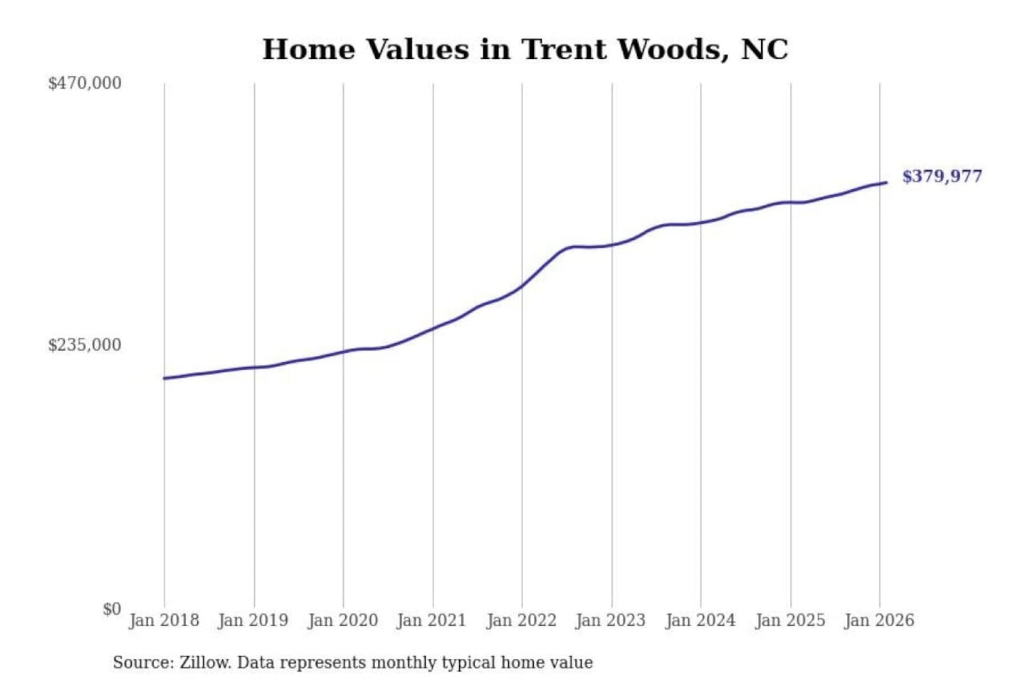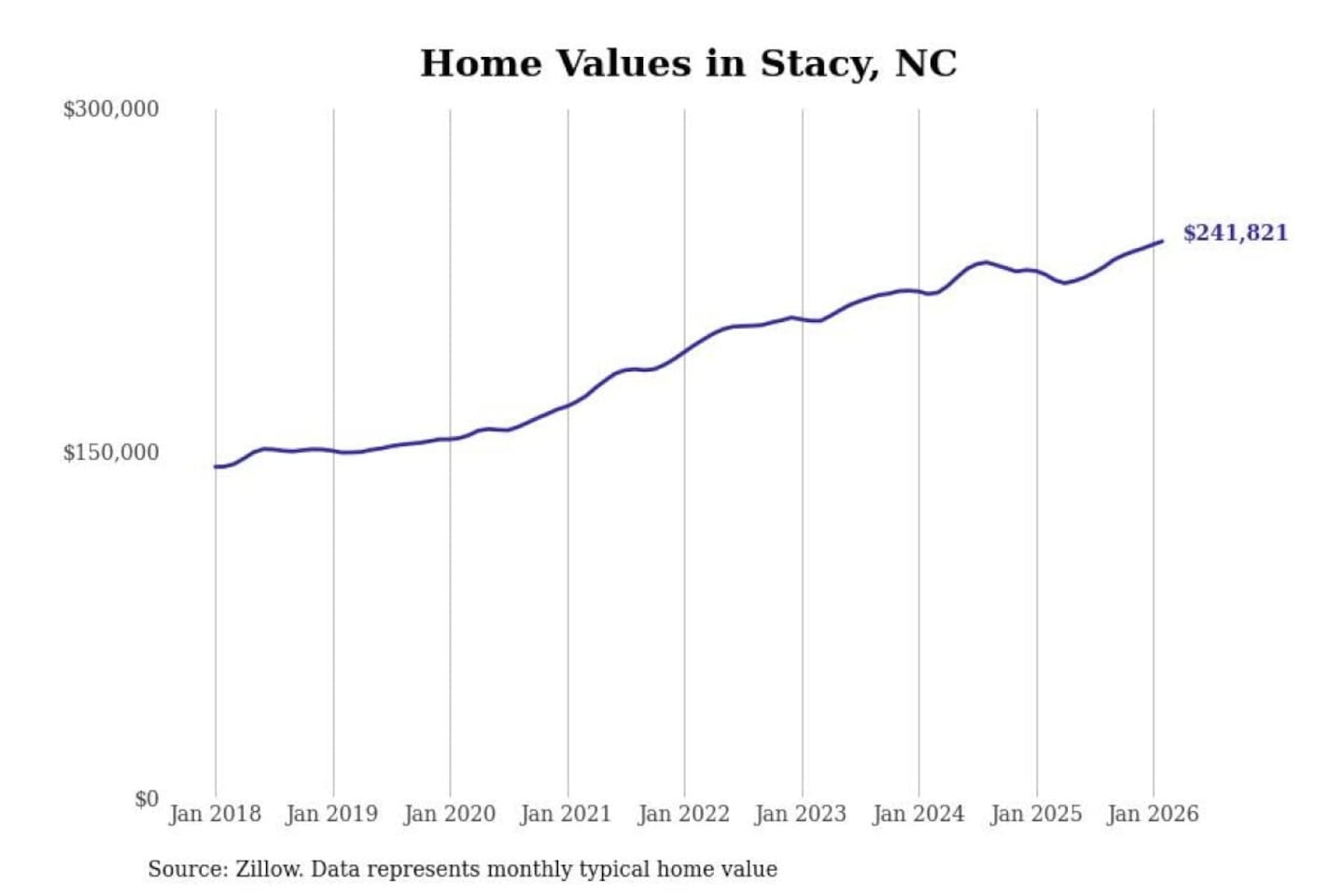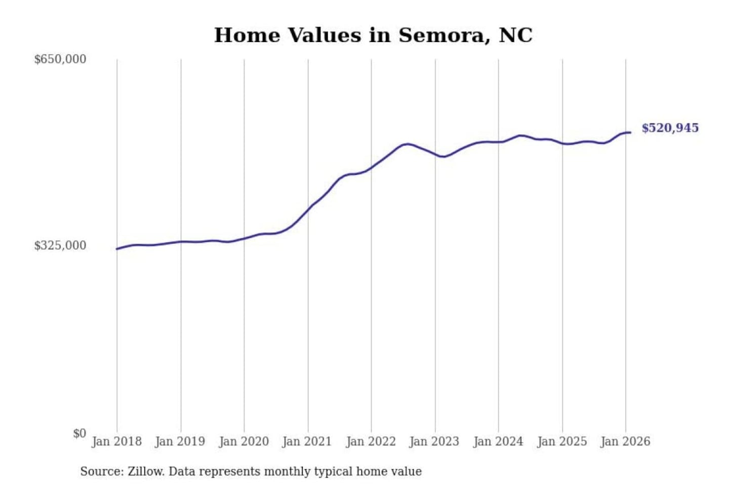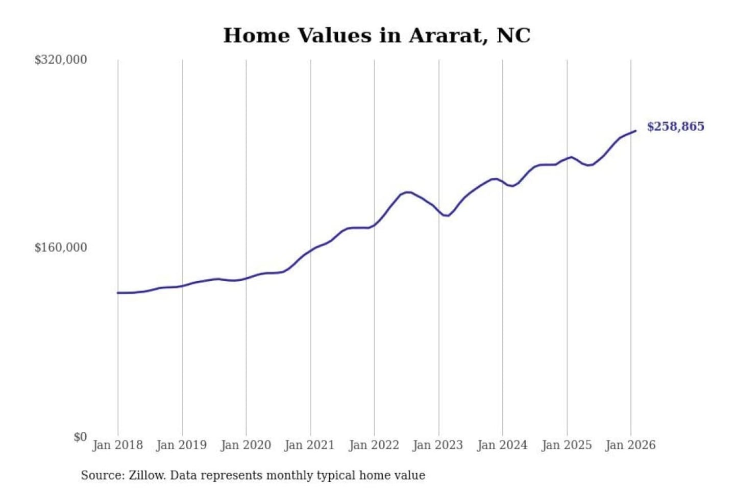 Stacker compiled a list of cities with the fastest-growing home prices in North Carolina using data from Zillow. Cities are ranked by the dollar change in the Zillow Home Values Index for all homes from the 12 months ending February 2026. The charts in this story were created automatically using Matplotlib. Data was available for 50 cities and towns in North Carolina.