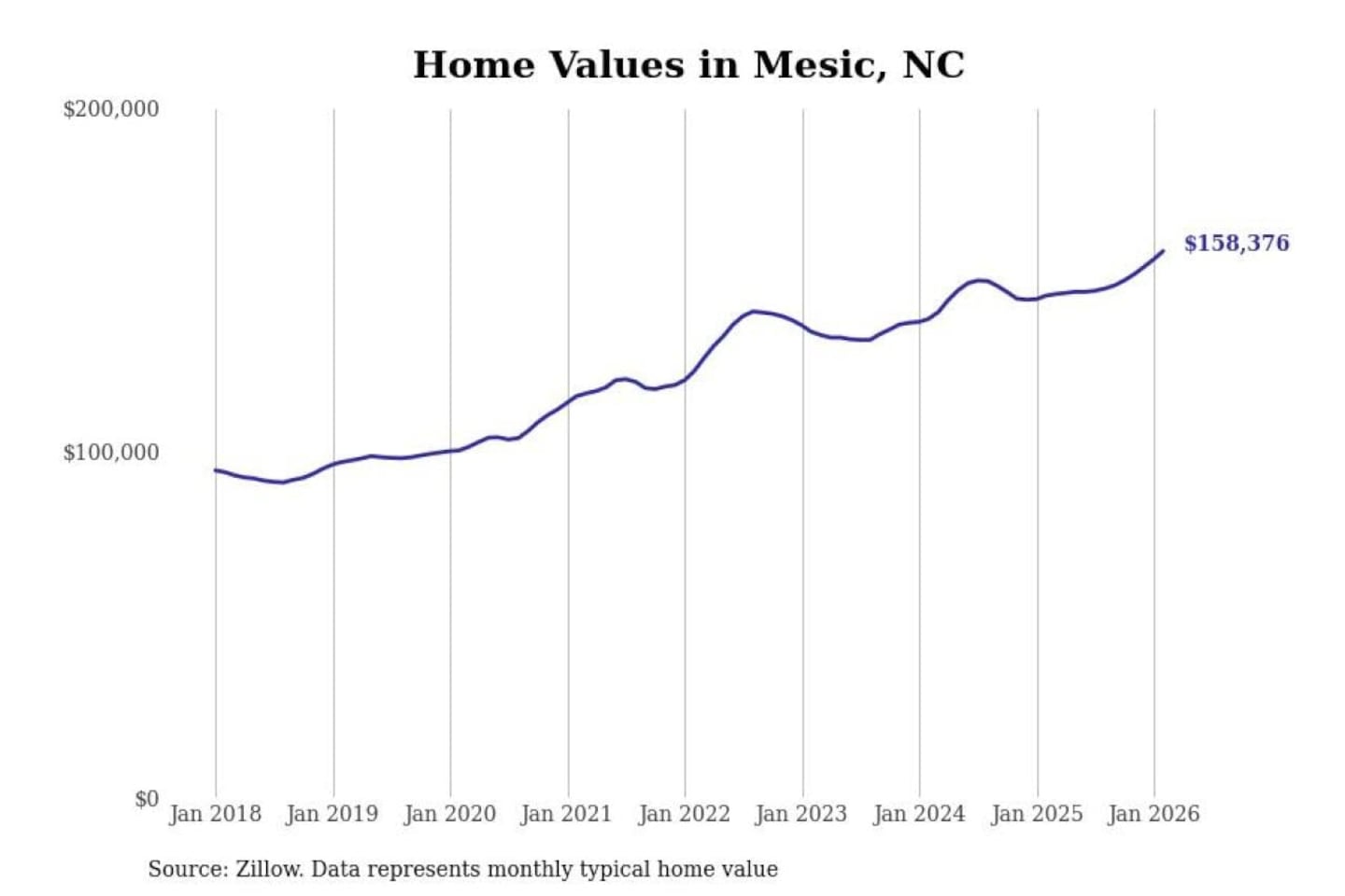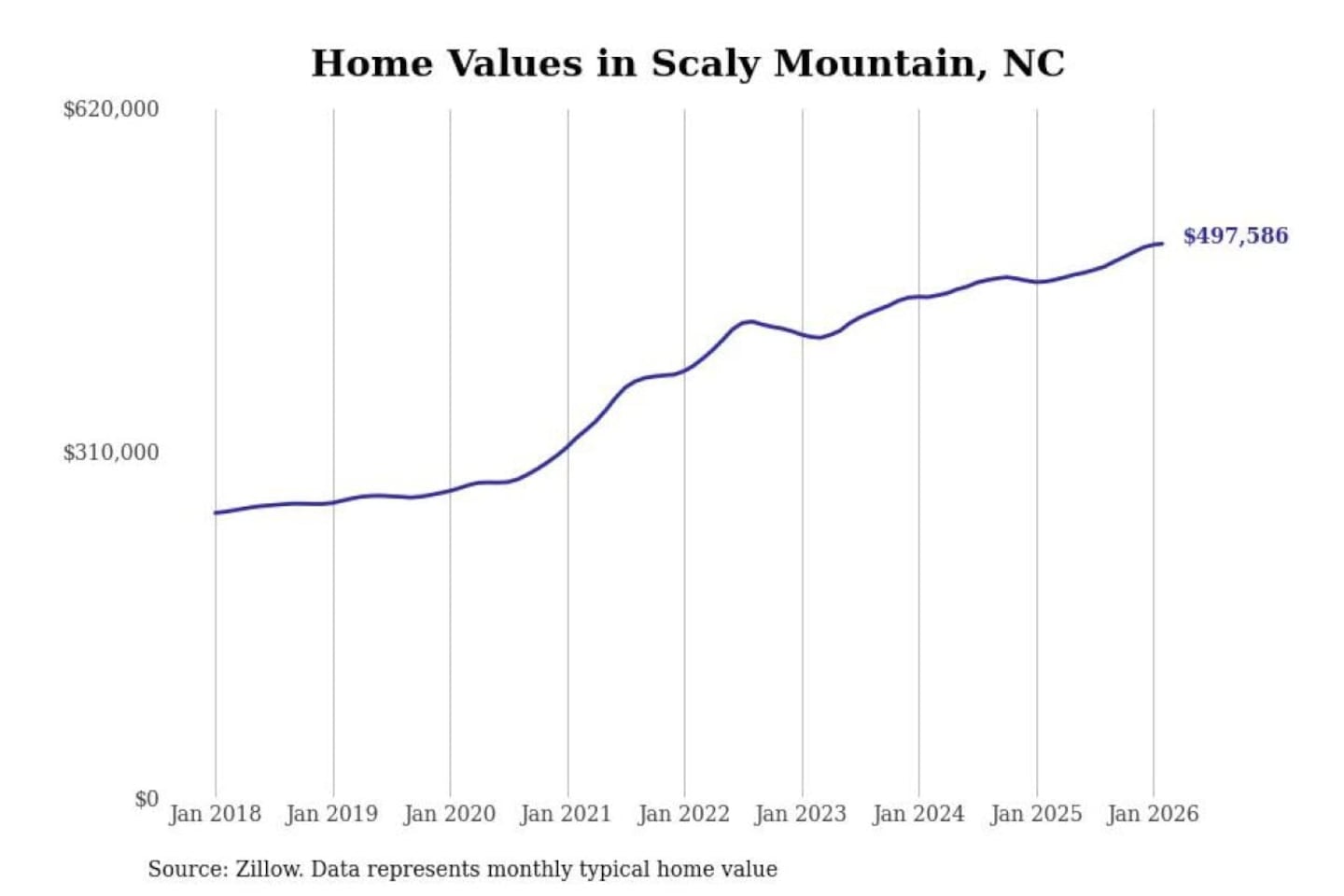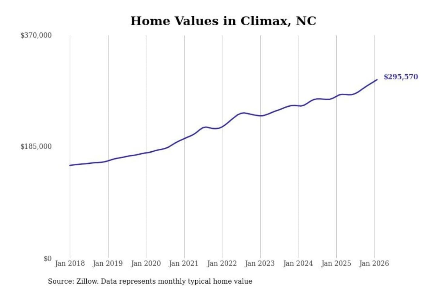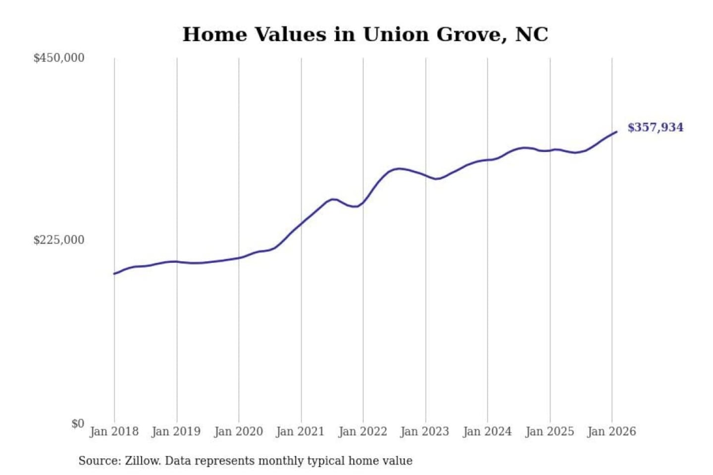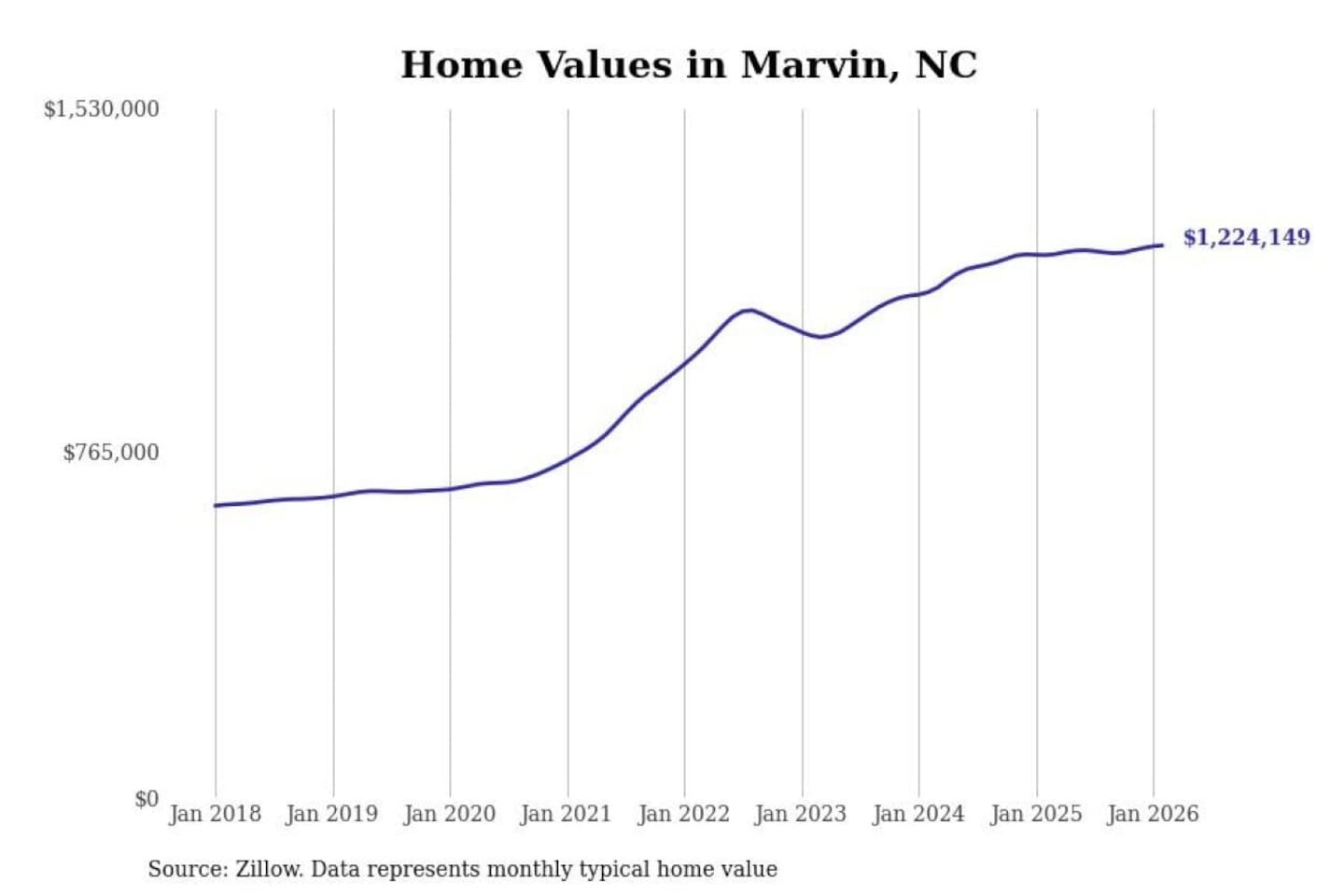 Stacker compiled a list of cities with the fastest-growing home prices in North Carolina using data from Zillow. Cities are ranked by the dollar change in the Zillow Home Values Index for all homes from the 12 months ending February 2026. The charts in this story were created automatically using Matplotlib. Data was available for 50 cities and towns in North Carolina.