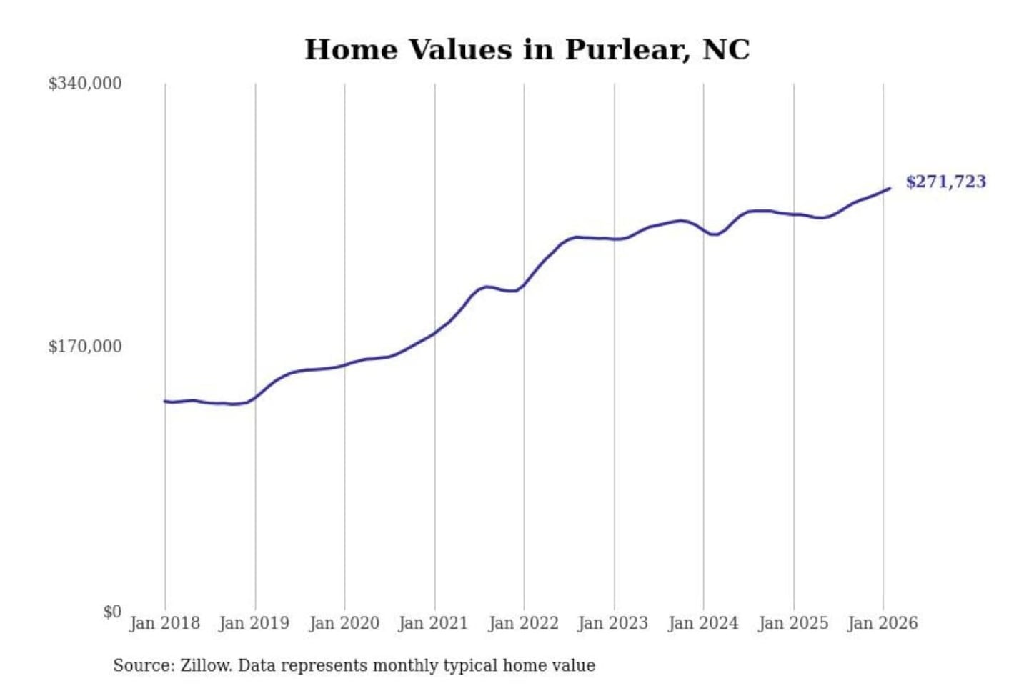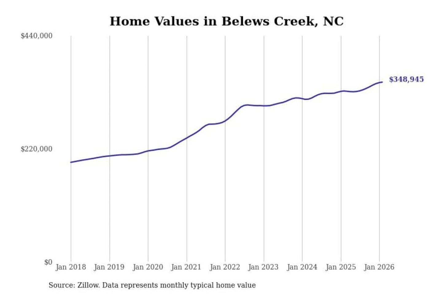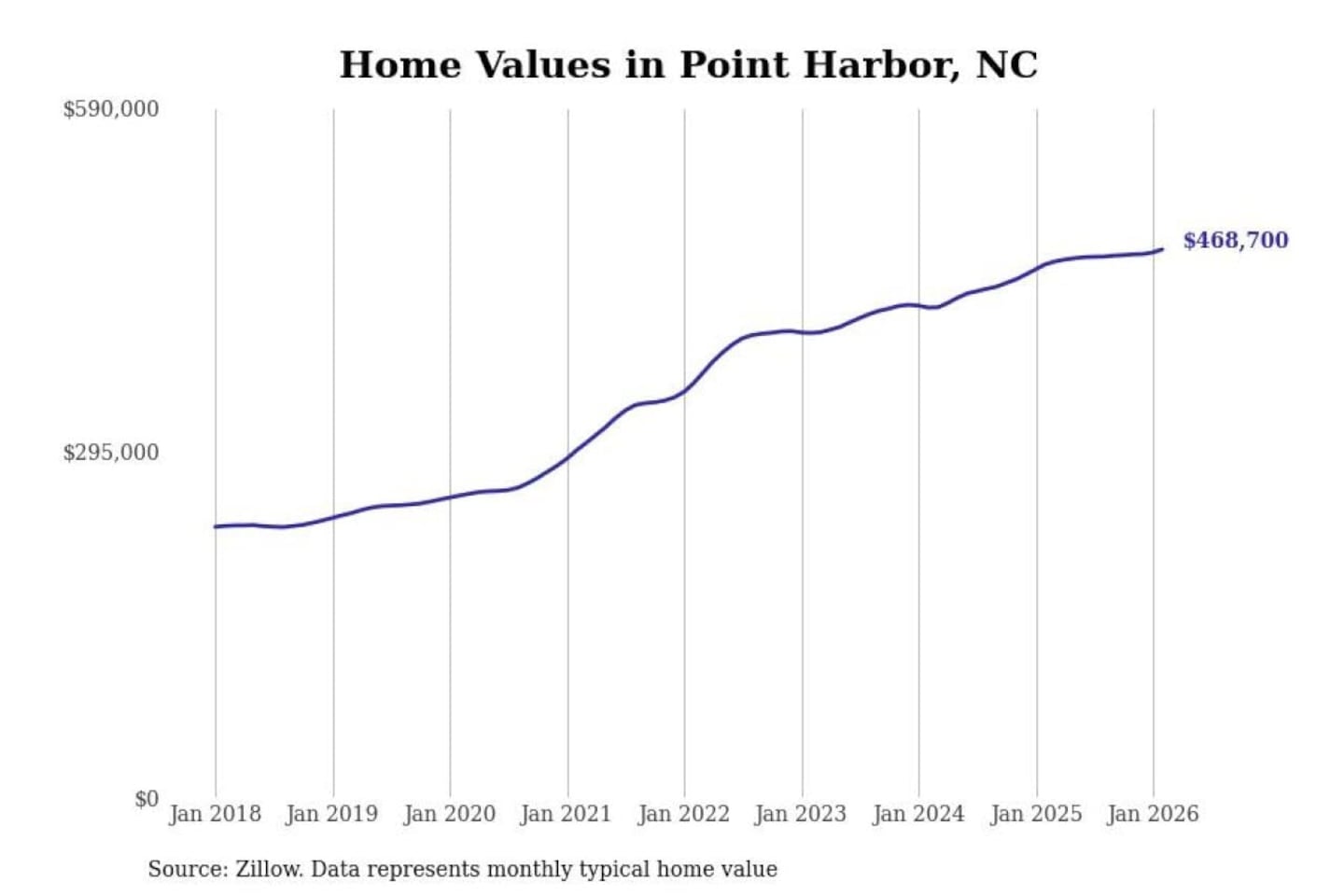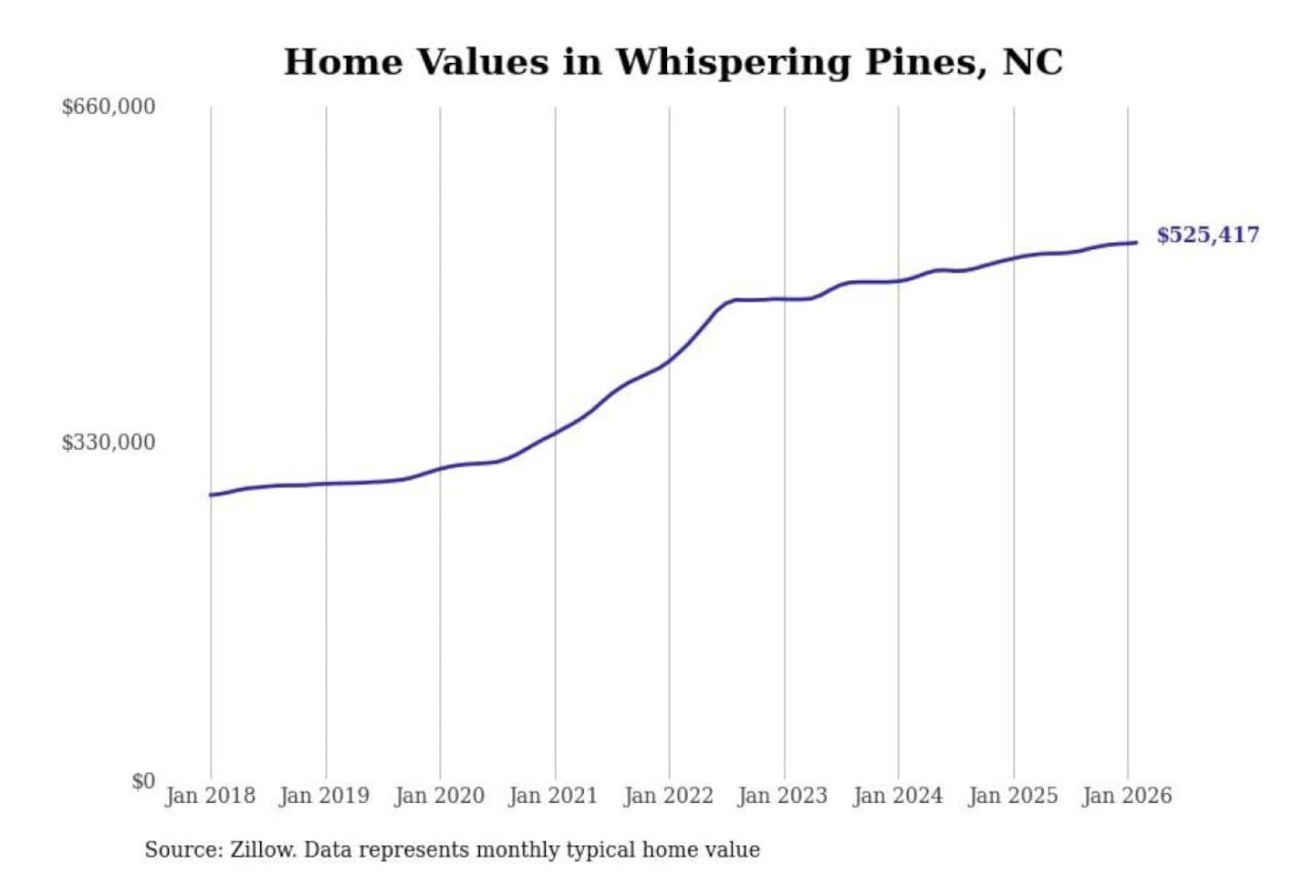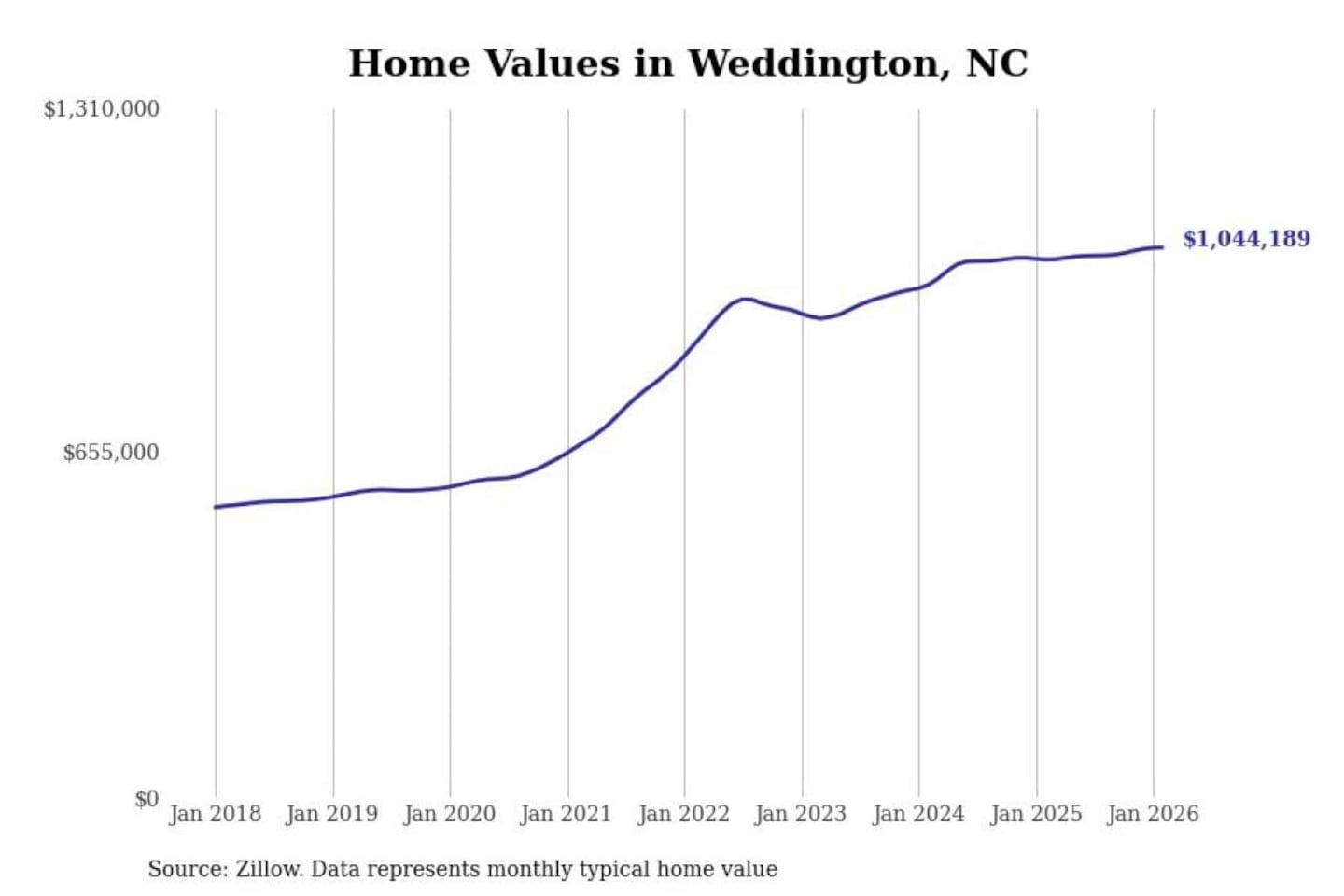 Stacker compiled a list of cities with the fastest-growing home prices in North Carolina using data from Zillow. Cities are ranked by the dollar change in the Zillow Home Values Index for all homes from the 12 months ending February 2026. The charts in this story were created automatically using Matplotlib. Data was available for 50 cities and towns in North Carolina.