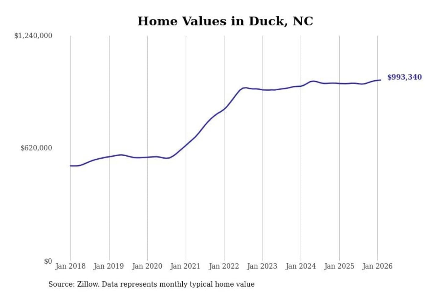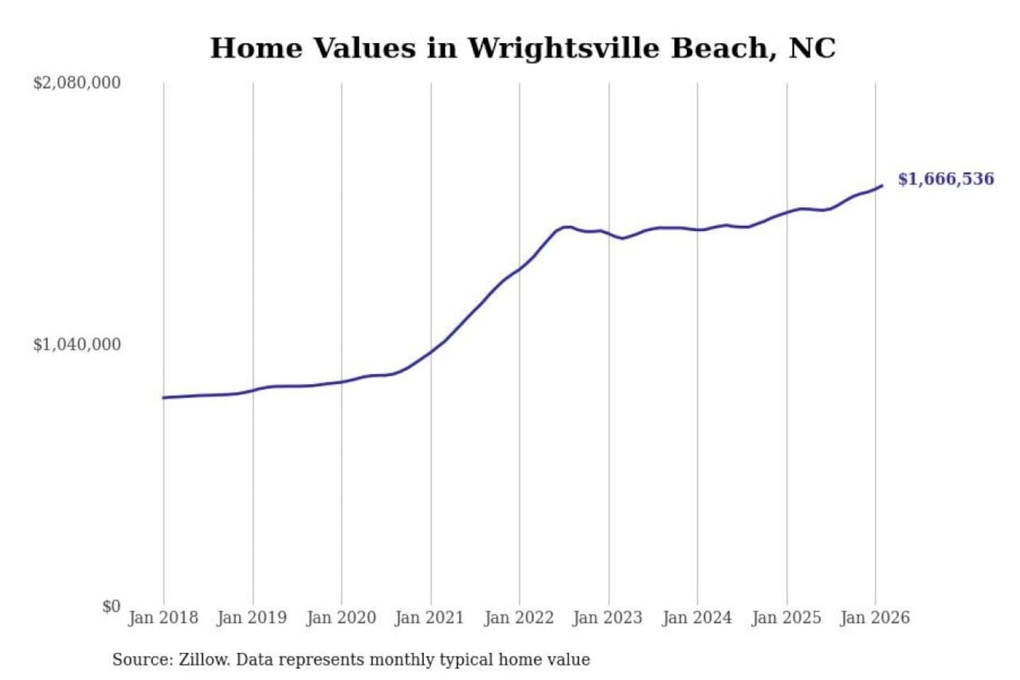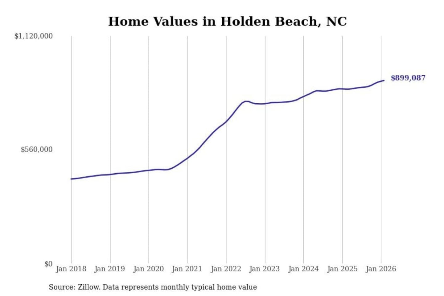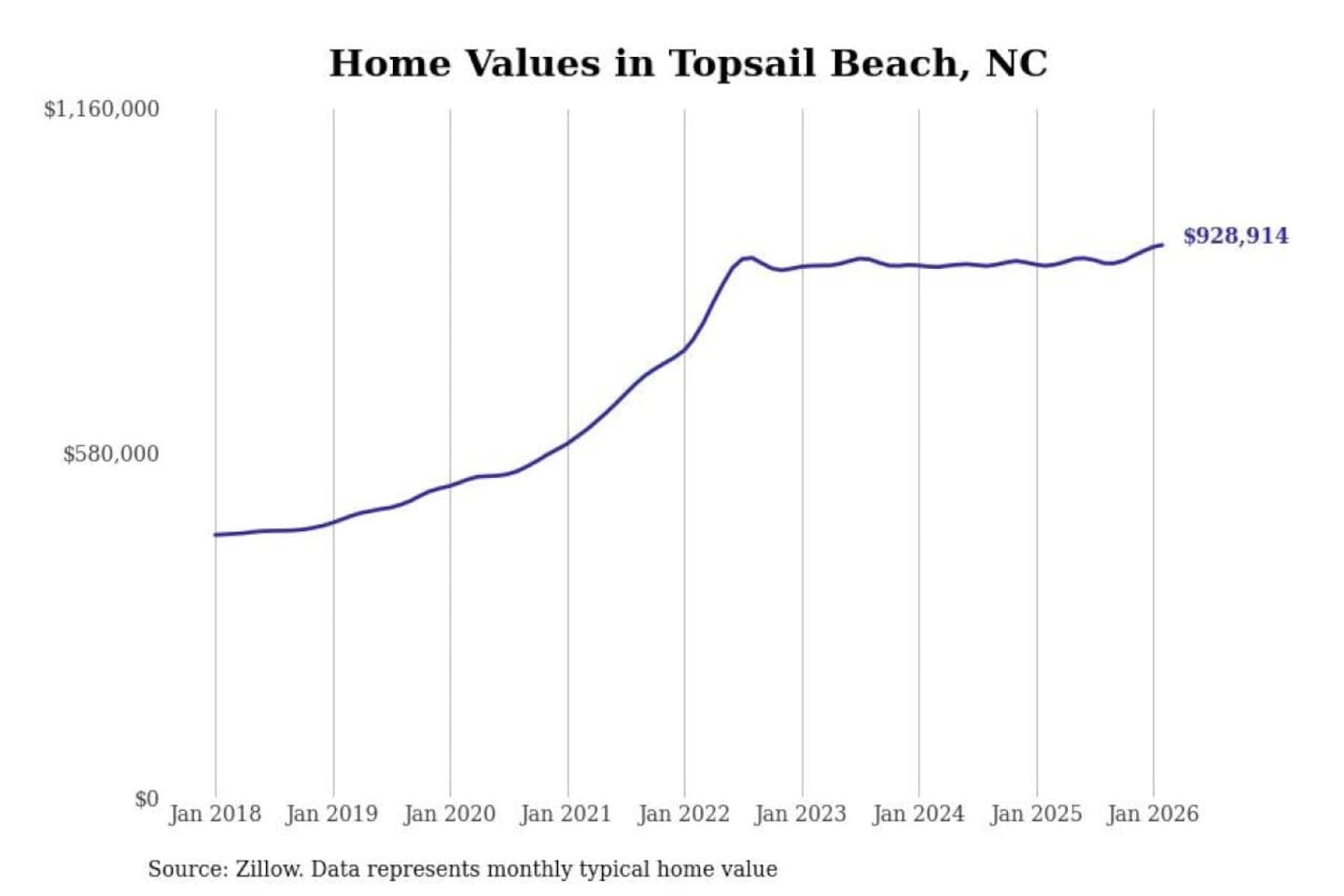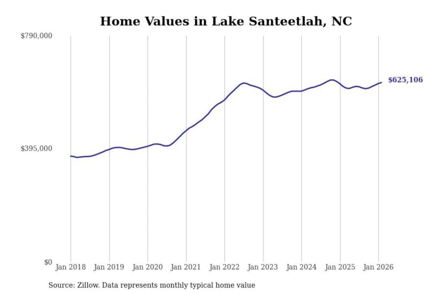 Stacker compiled a list of cities with the fastest-growing home prices in North Carolina using data from Zillow. Cities are ranked by the dollar change in the Zillow Home Values Index for all homes from the 12 months ending February 2026. The charts in this story were created automatically using Matplotlib. Data was available for 50 cities and towns in North Carolina.