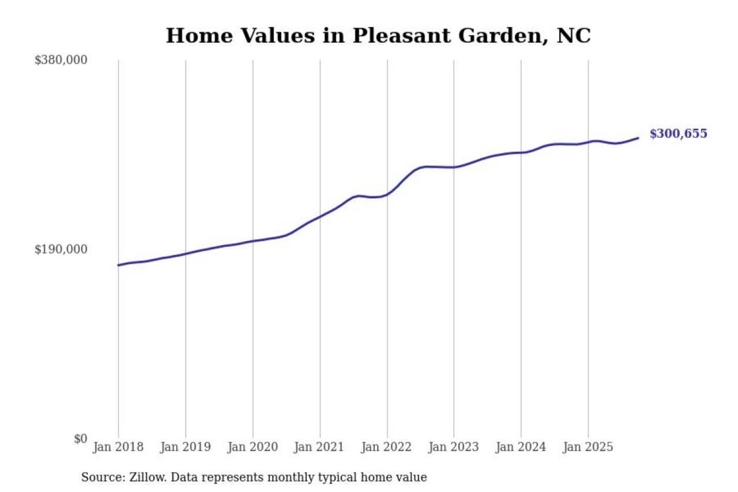 Stacker compiled a list of cities with the most expensive homes in the Greensboro metro area using data from Zillow. Charts show the monthly typical home value since January 2018. Data was available for 32 cities and towns.