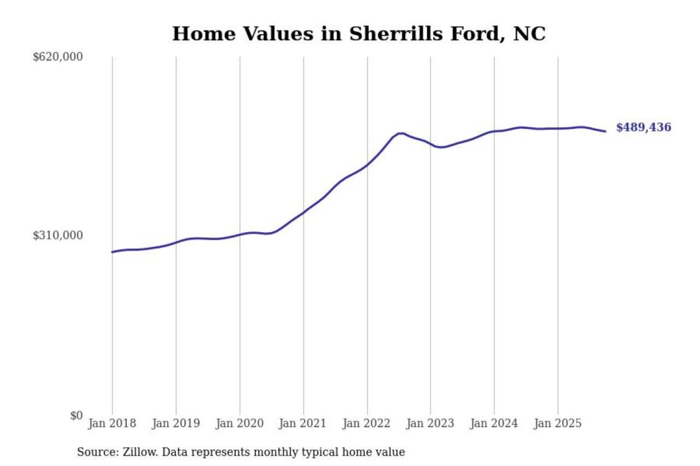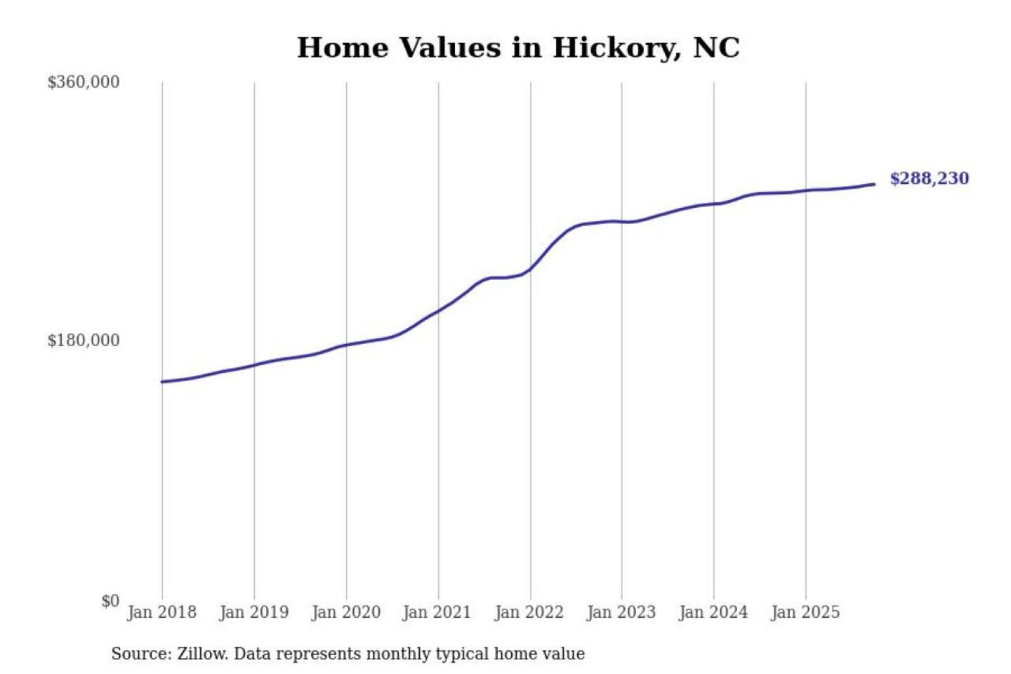 Stacker compiled a list of cities with the most expensive homes in the Hickory metro area using data from Zillow. Charts show the monthly typical home value since January 2018. All 25 cities and towns with data available were included in the list.