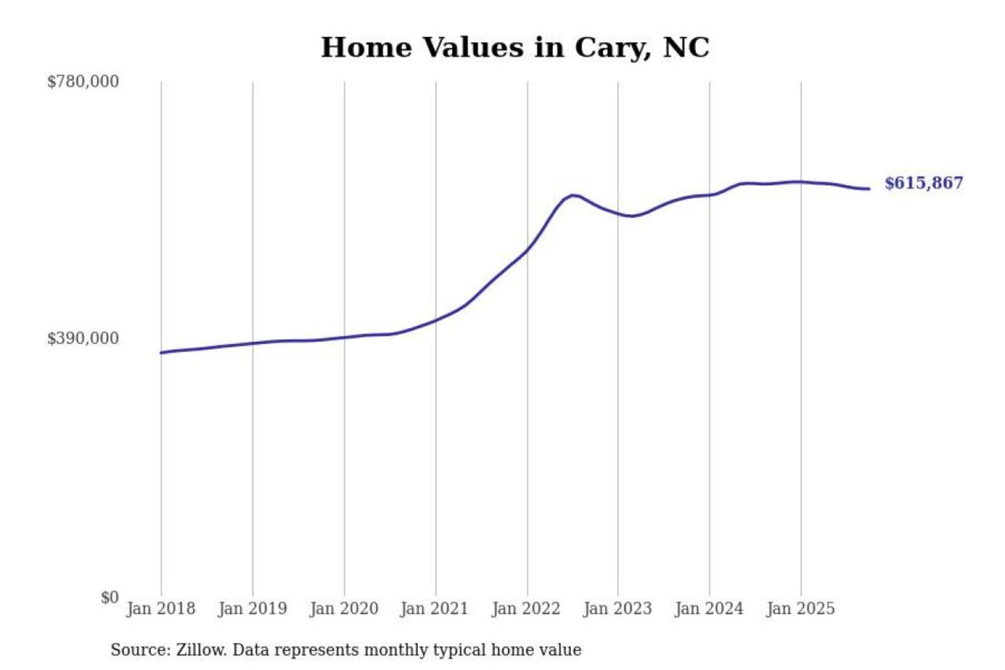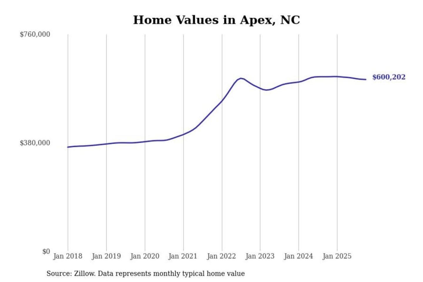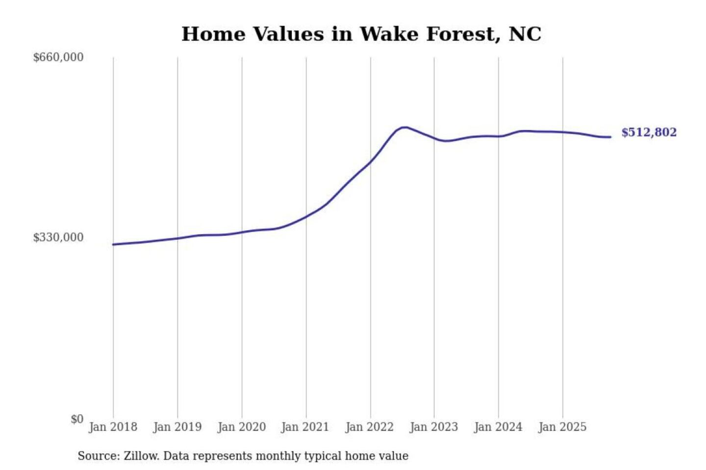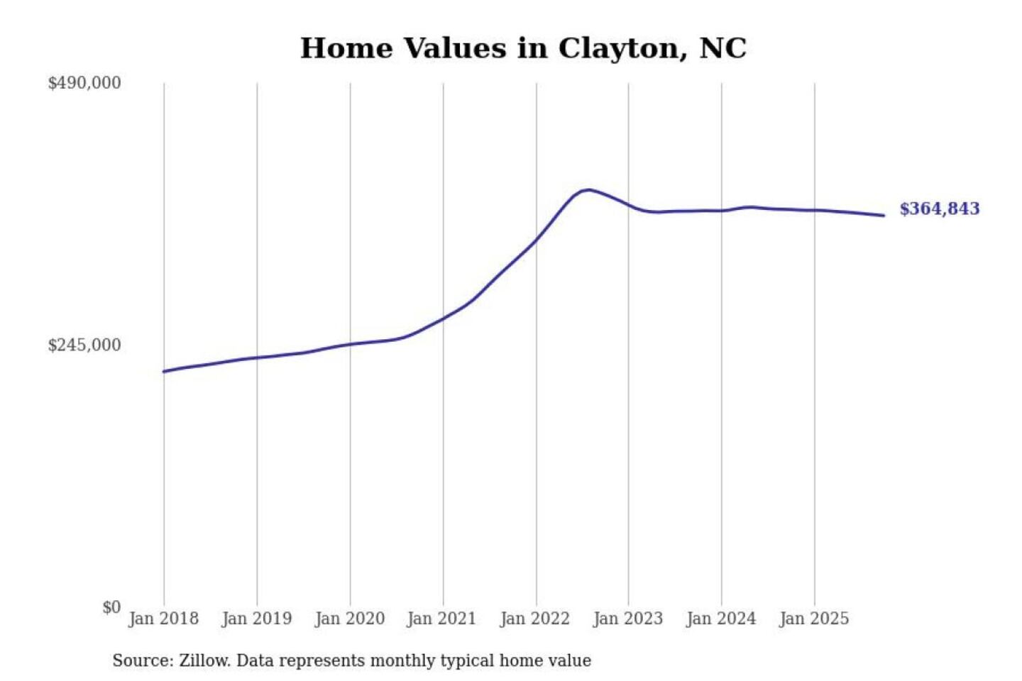 Stacker compiled a list of cities with the most expensive homes in the Raleigh metro area using data from Zillow. Charts show the monthly typical home value since January 2018. All 25 cities and towns with data available were included in the list.
