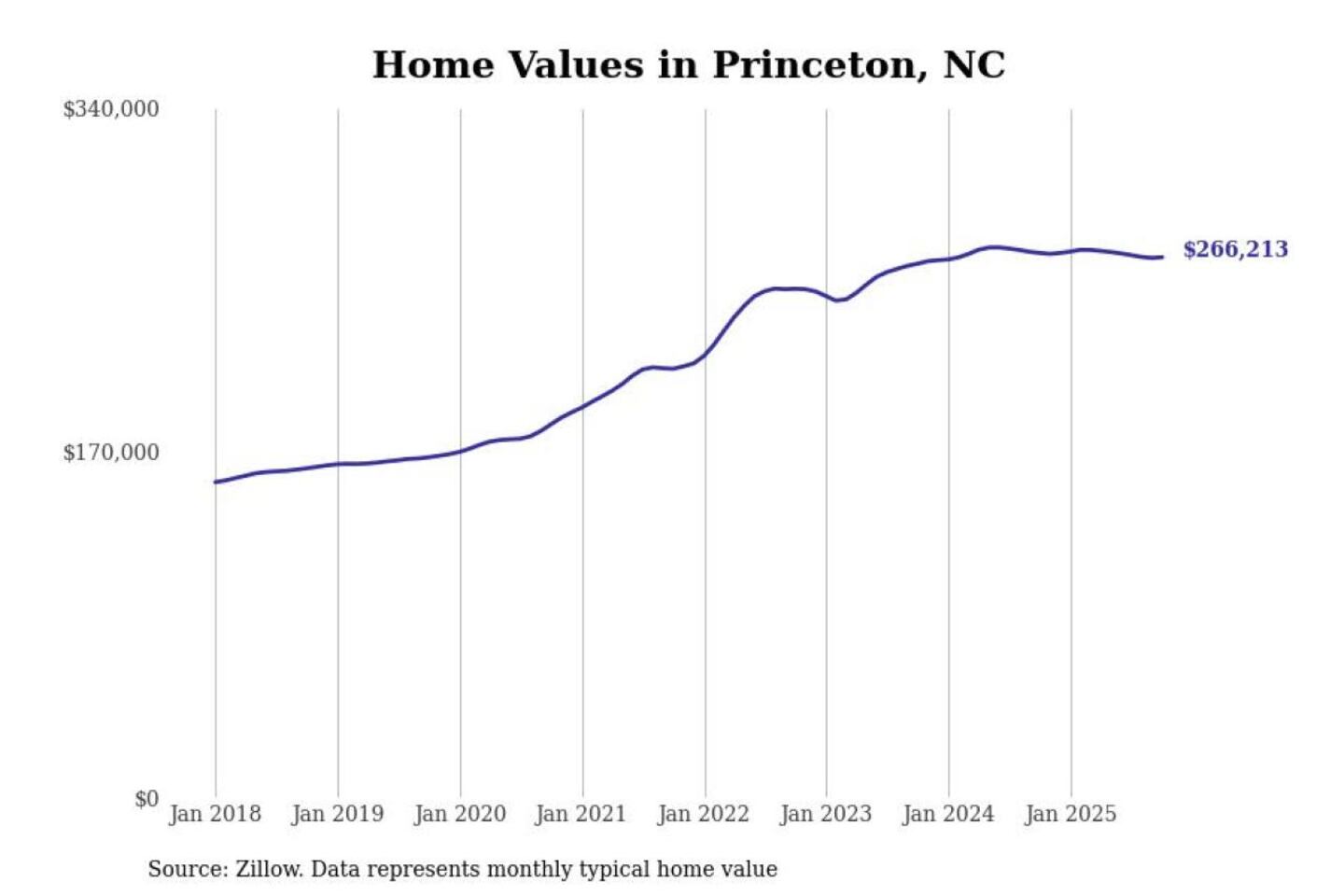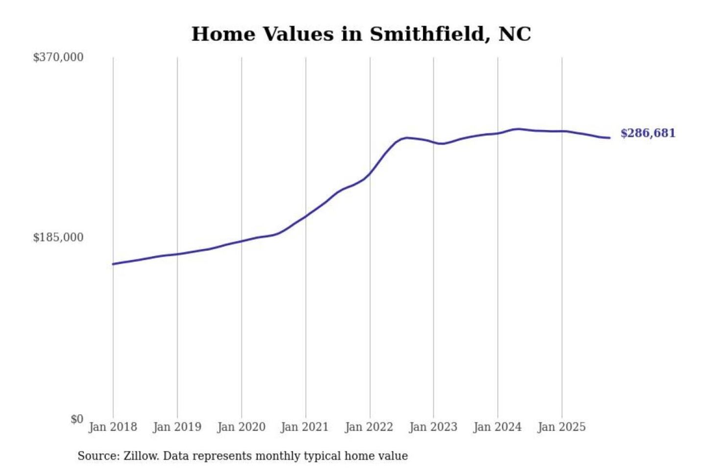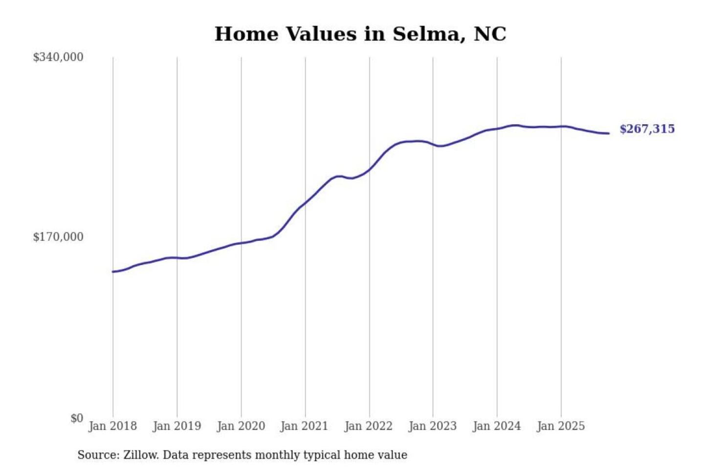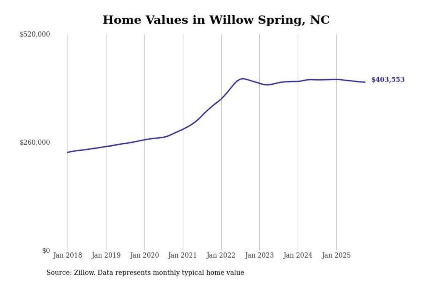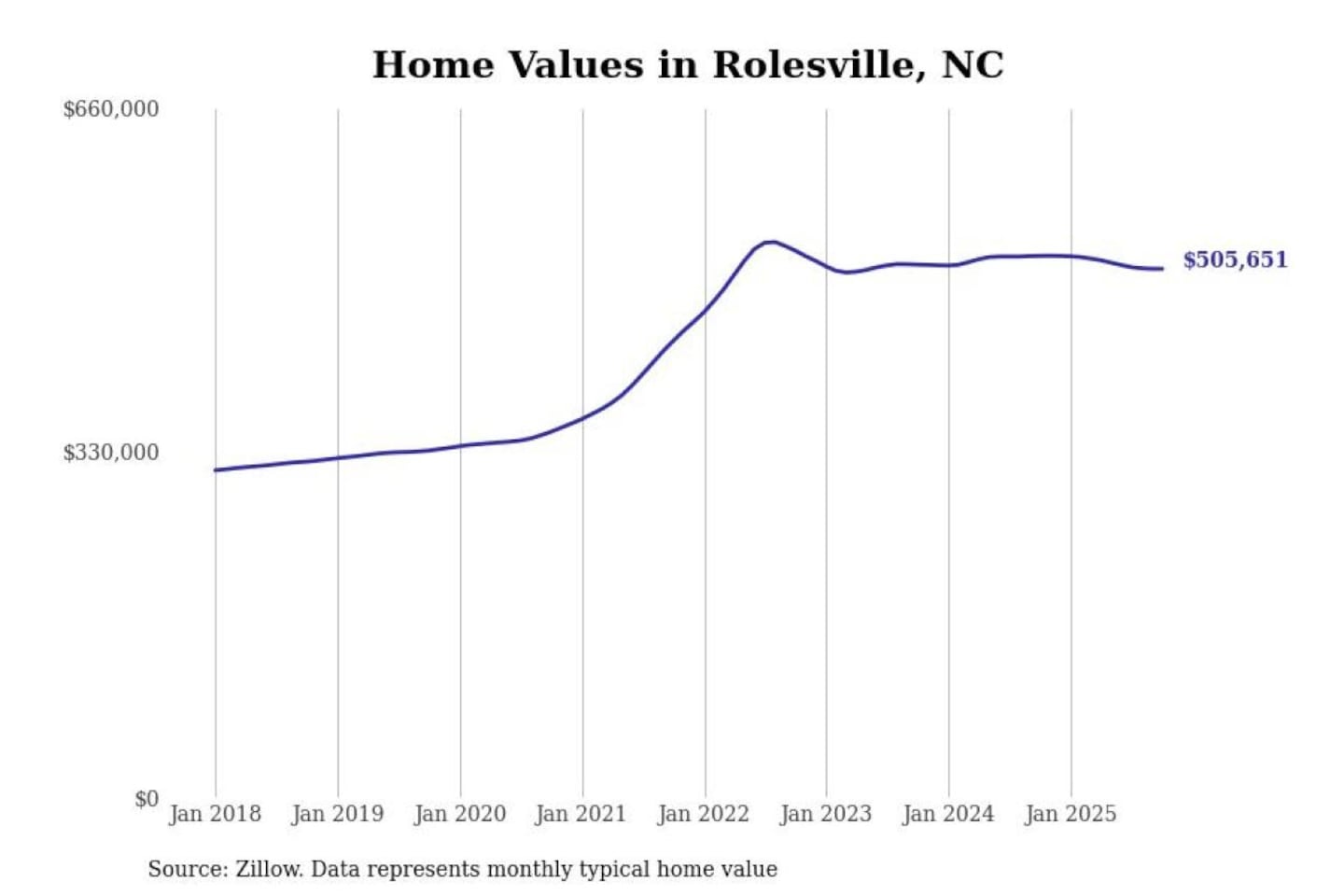 Stacker compiled a list of cities with the most expensive homes in the Raleigh metro area using data from Zillow. Charts show the monthly typical home value since January 2018. All 25 cities and towns with data available were included in the list.