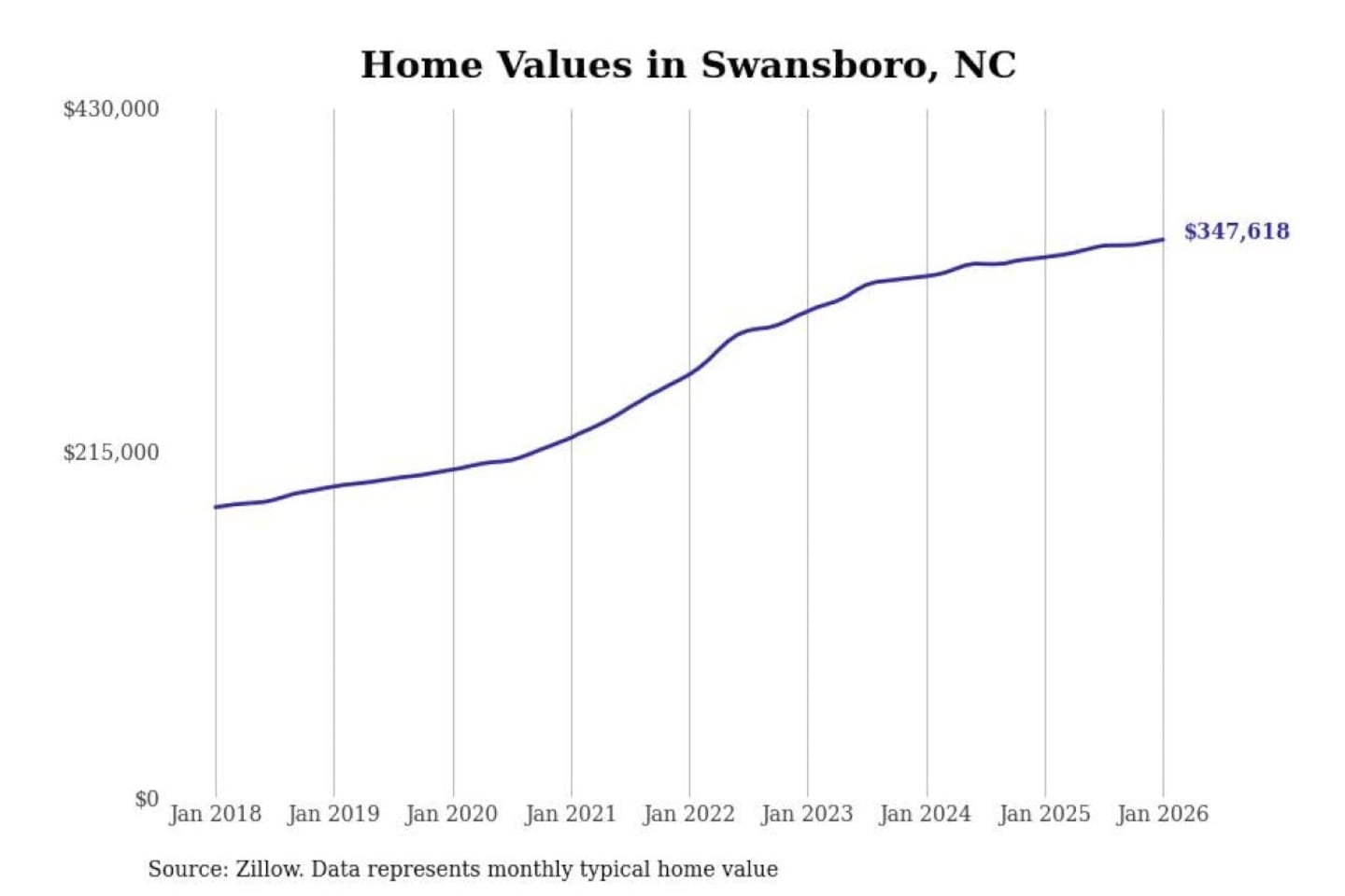Stacker compiled a list of cities with the most expensive homes in the Jacksonville, North Carolina metro area using data from Zillow. Charts show the monthly typical home value since January 2018. All 11 cities and towns with data available were included in the list.