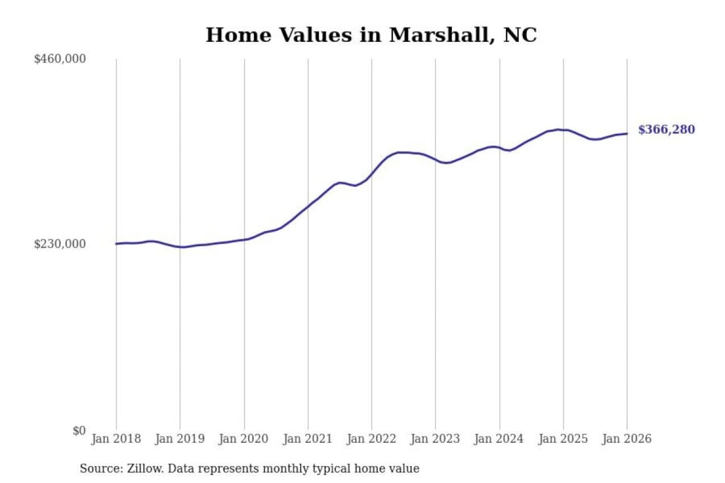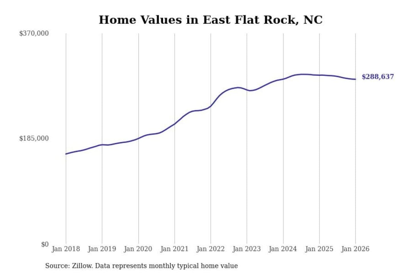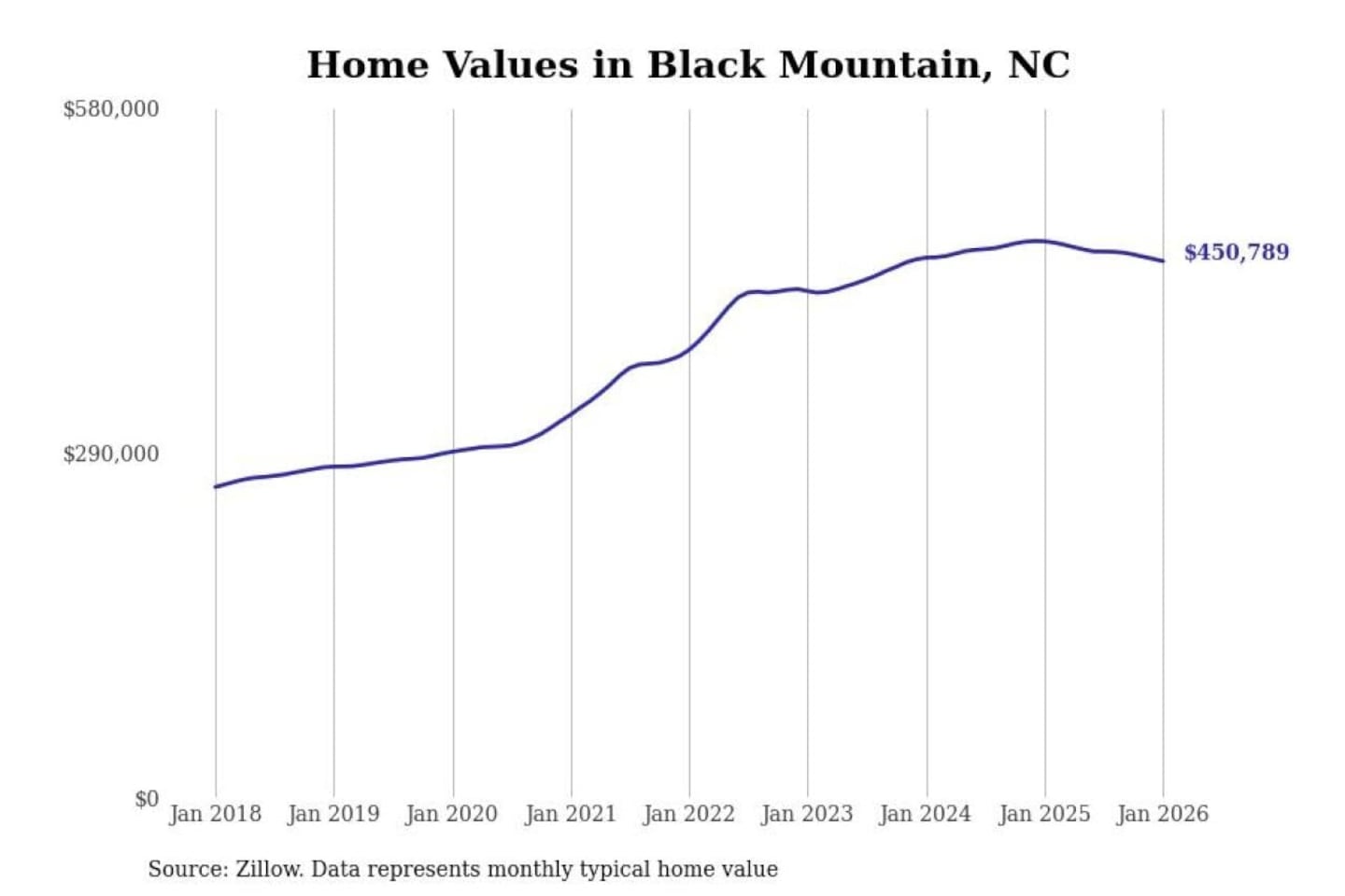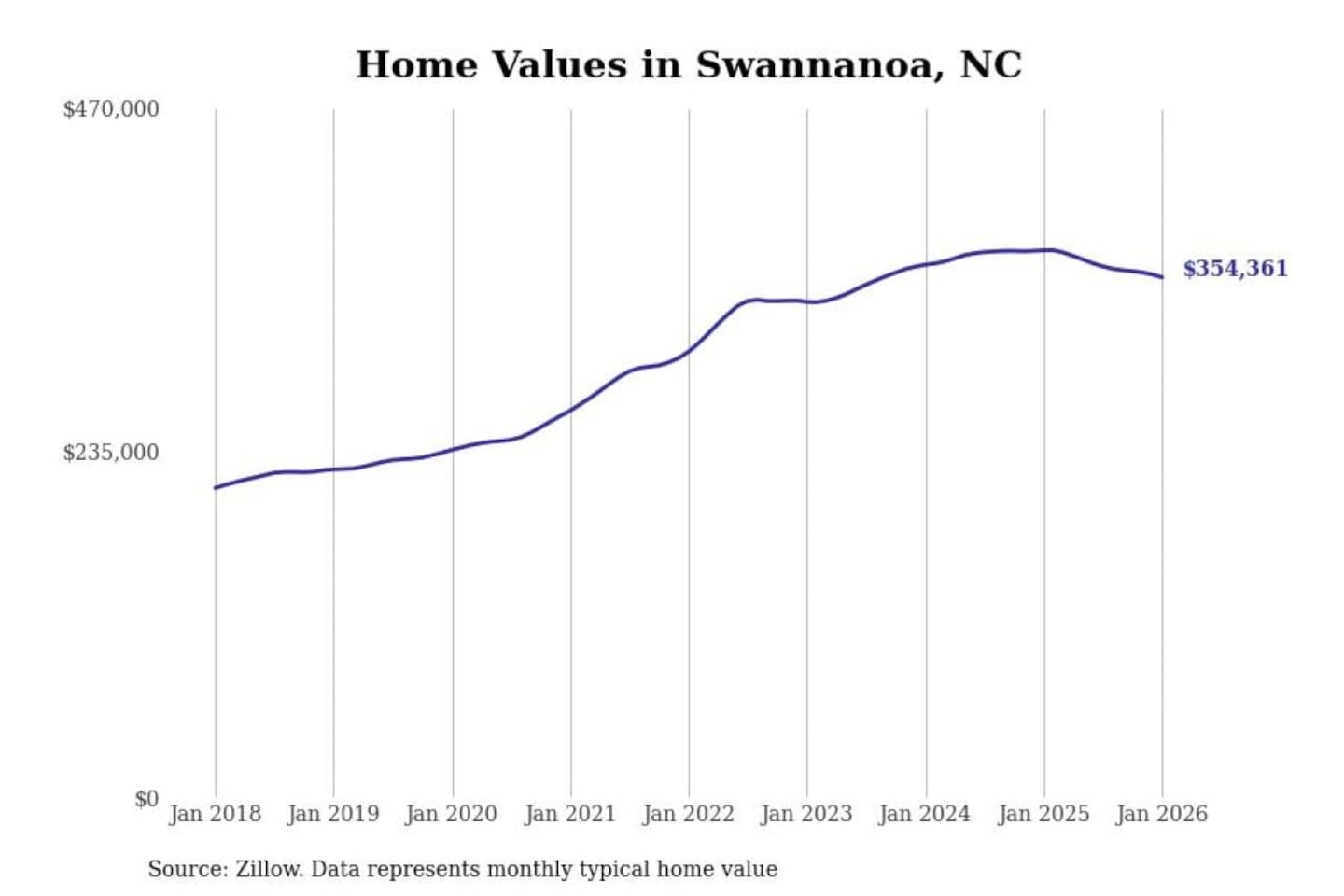 Stacker compiled a list of cities with the most expensive homes in the Asheville metro area using data from Zillow. Charts show the monthly typical home value since January 2018. Data was available for 30 cities and towns.