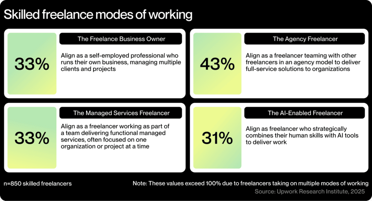 The Agency Freelancer, representing 43% of skilled freelancers, teams up with other freelancers through an agency model that provides end-to-end services to organizations.