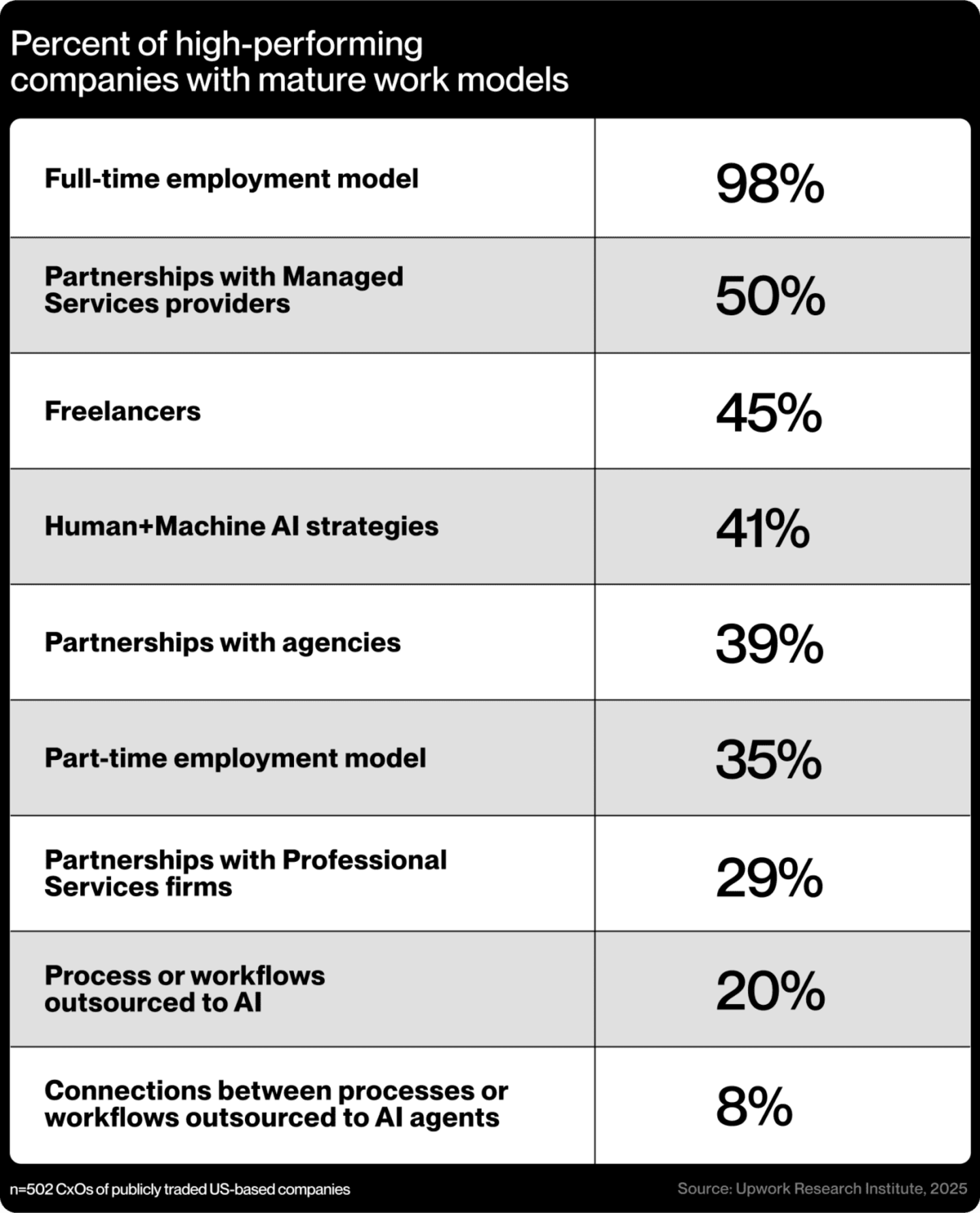 The Upwork Research Institute conducted an additional survey of 502 U.S.-based C-level executives with hiring responsibilities within their organizations in December 2024. These executives represented publicly traded organizations in the business and professional services, healthcare and medical, manufacturing, retail and consumer goods, and software and technology industries.