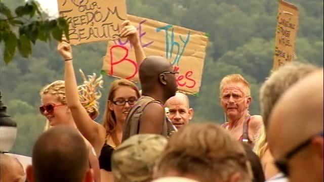 ASHEVILLE, N.C.,None — A North Carolina protest proves that a demonstration with bare-breasted women demanding the right to go topless will draw a crowd.
