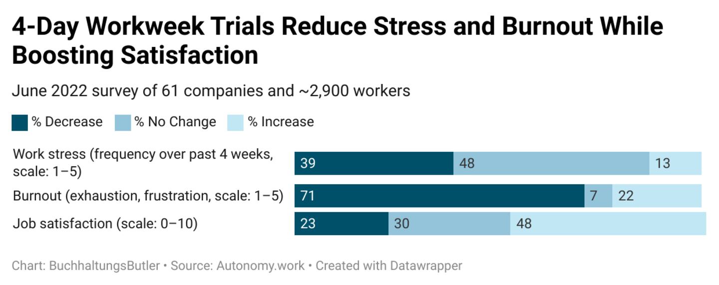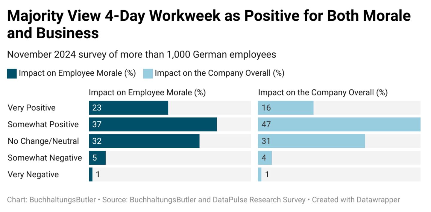A recent study by BuchhaltungsButler in collaboration with DataPulse Research found that companies implementing a four-day work week—permanently, partially, or on a trial basis—reported higher morale. Many also saw the shorter week as beneficial for business.