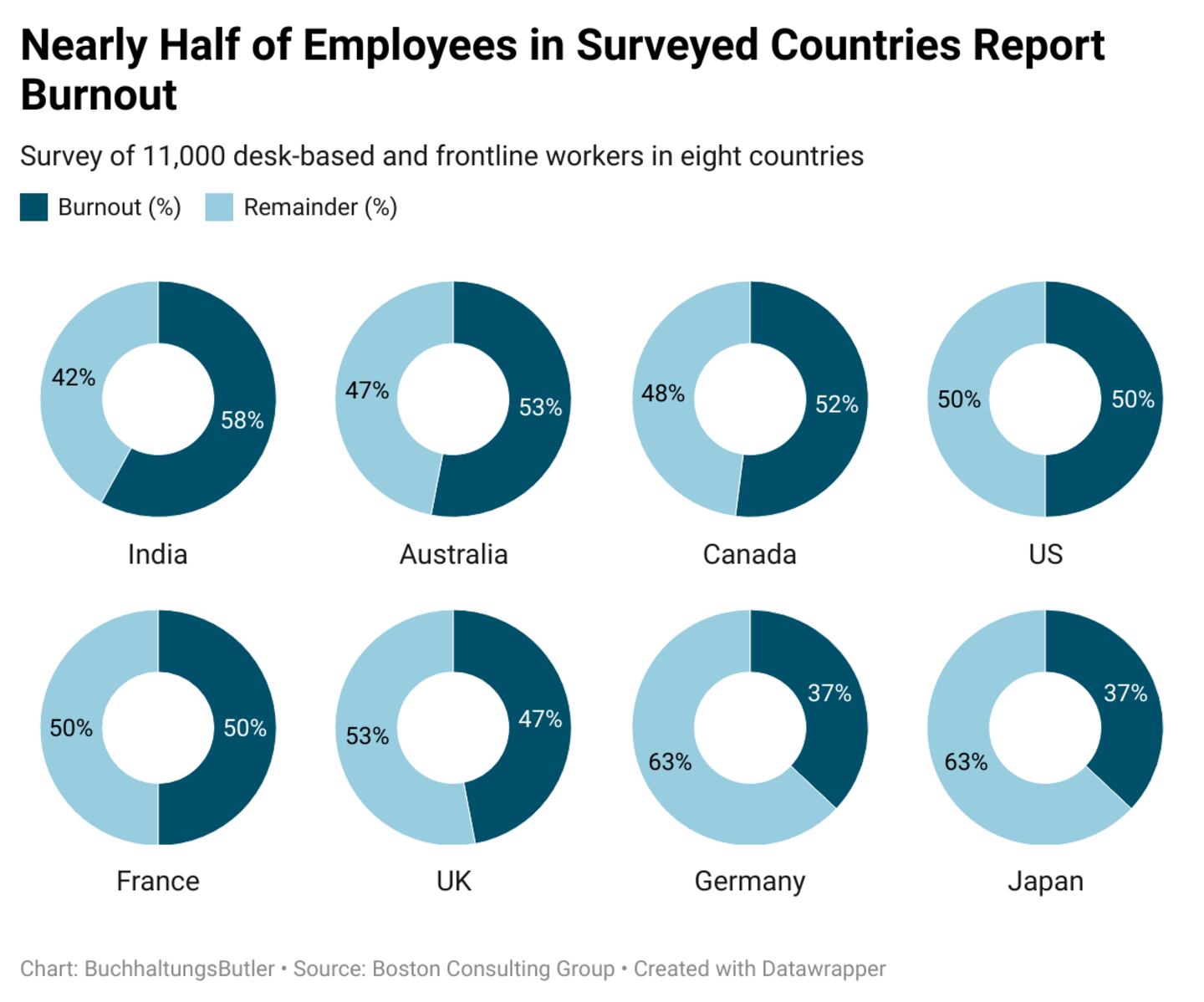 In Glassdoor's July 2024 Employee Confidence Index, researchers found that employee mentions of burnout are up 44% from pre-pandemic levels. Likewise, a Boston Consulting Group survey of 11,000 workers in eight countries found that nearly half are dealing with the symptoms of burnout right now.