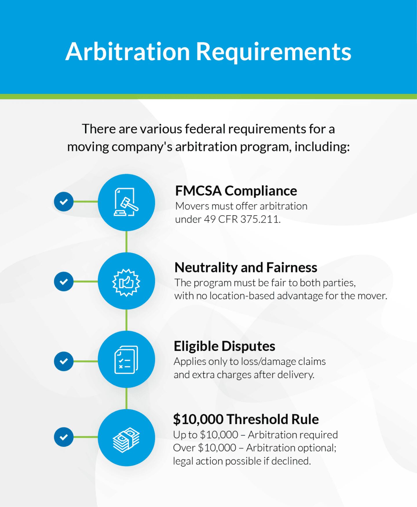There are various federal requirements for a moving company's arbitration program, including: