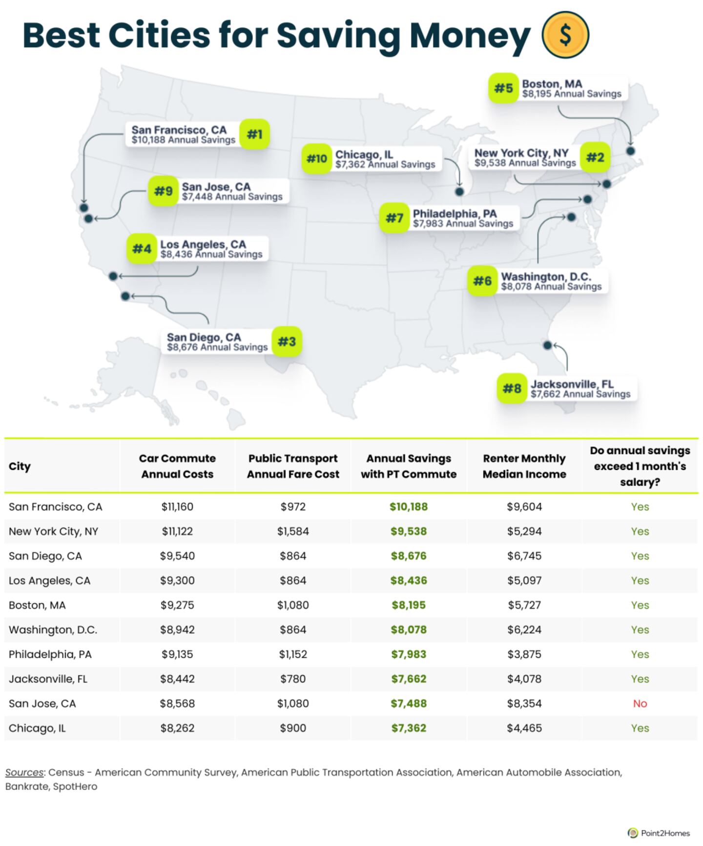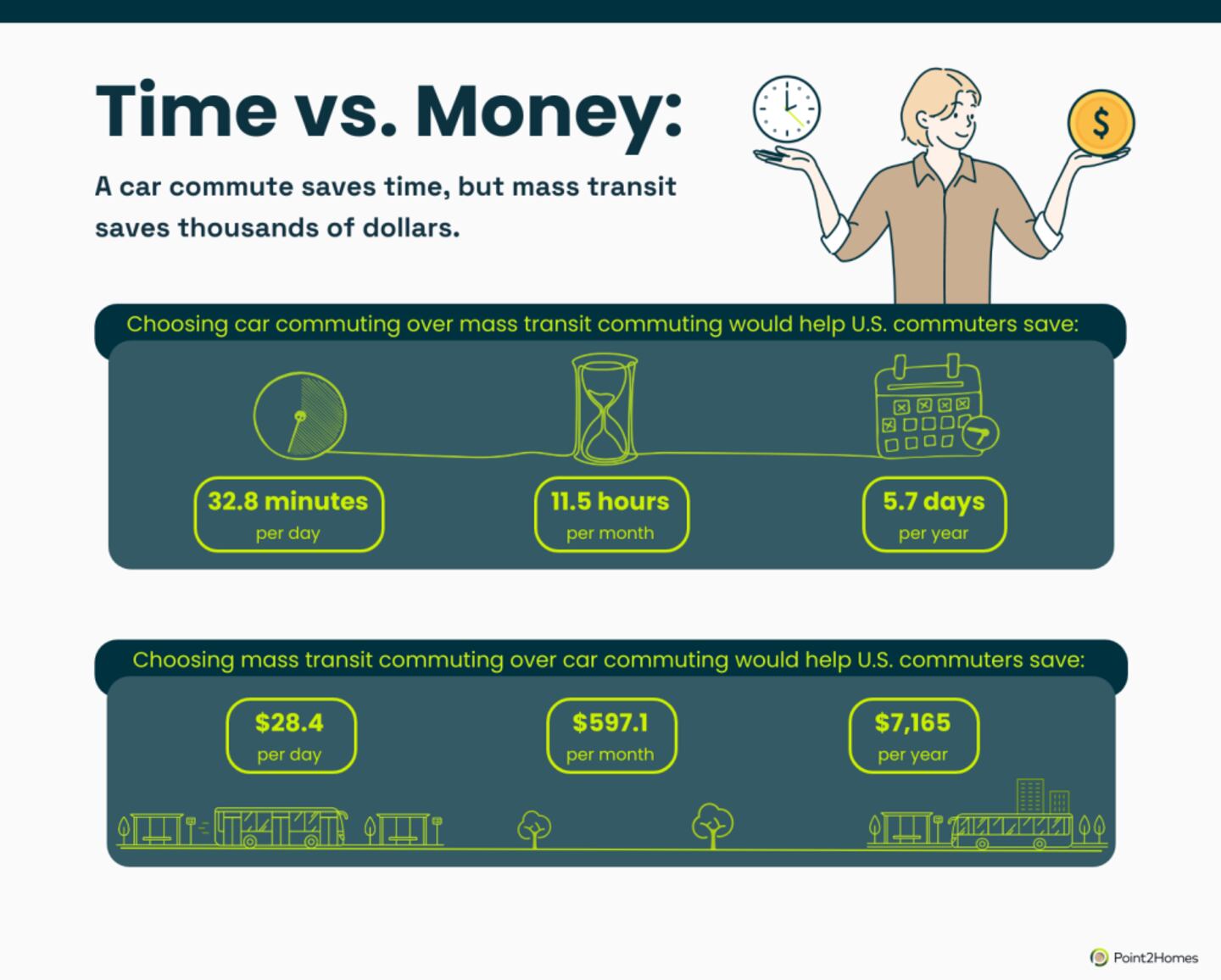- Commuting by car instead of public transit saves up to 218 hours (or nine days) per year in Las Vegas, while ditching the car in favor of the bus saves up to $10,000 per year in San Francisco.
