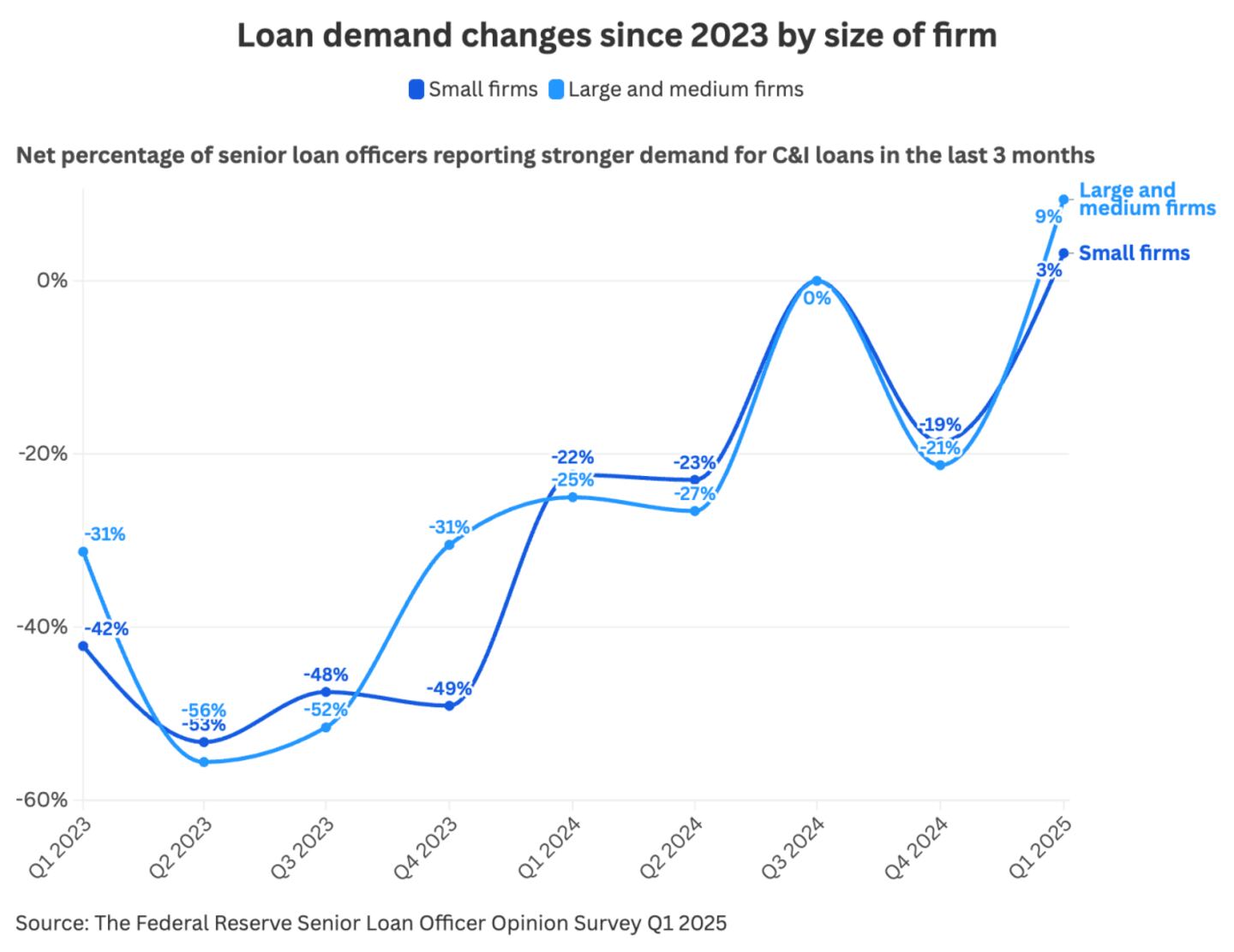 The Federal Reserve's Senior Loan Officer Opinion Survey from Q1 in 2025 suggests that it has become more challenging for small businesses in the United States to secure commercial and industrial loans. As economic uncertainty rises, banks are becoming more hesitant to lend money to low-collateral businesses.