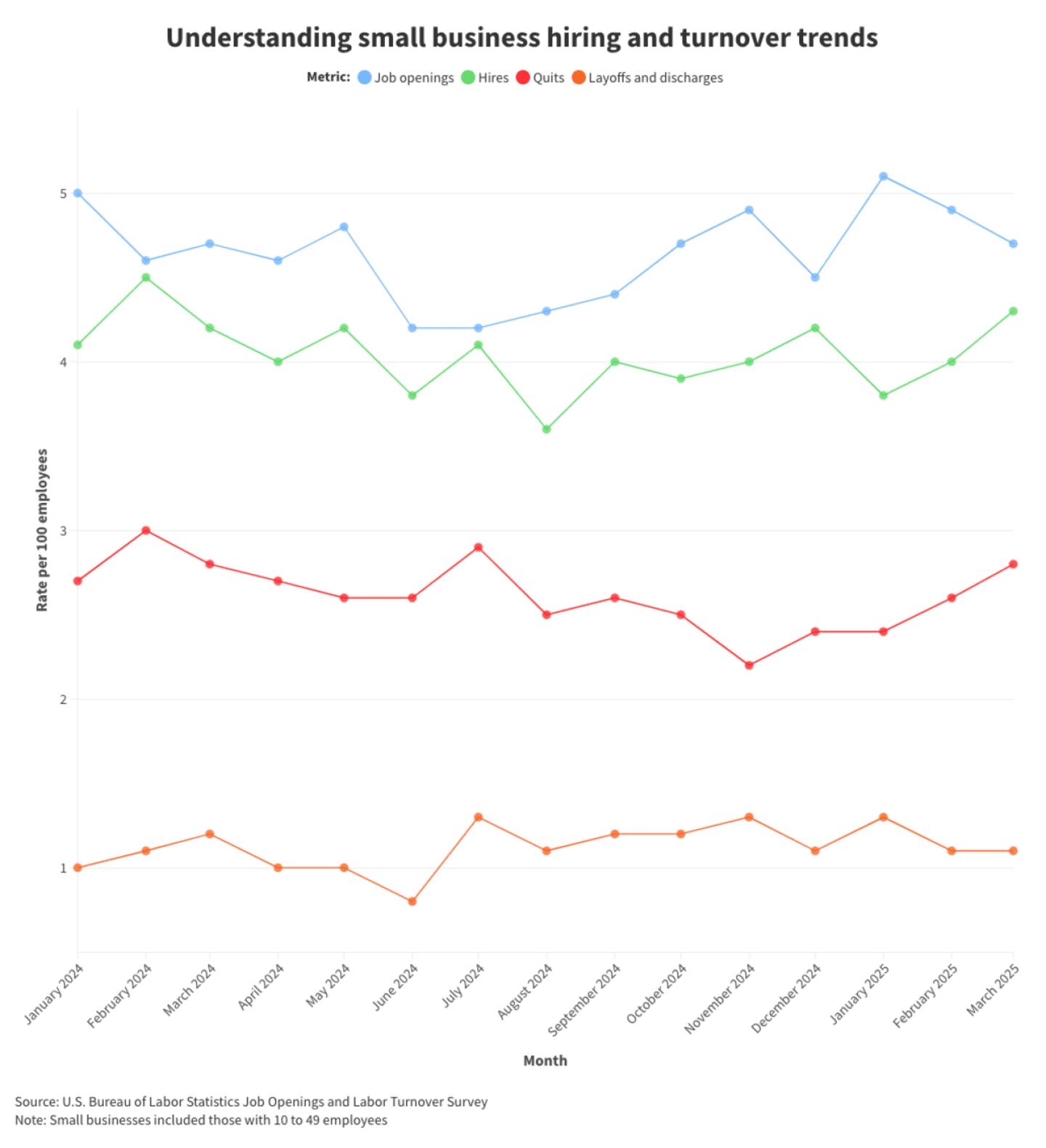 According to the BLS Job Openings and Labor Turnover Survey, staffing trends at small businesses (10 to 49 employees) have shifted in early 2025. Small business owners are treading carefully when it comes to growing their teams, but that doesn't mean hiring has stopped. Some are bringing on new people and finding ways to adapt in a shifting labor market.