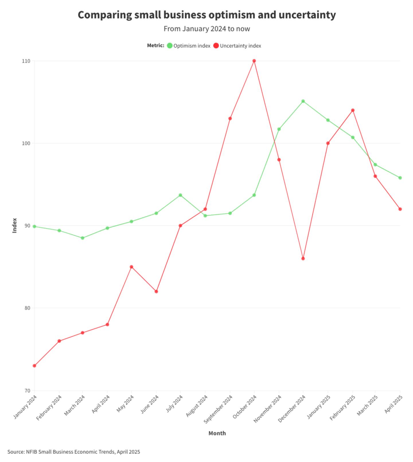 Right now, that mood isn't great. The NFIB Small Business Optimism Index has consistently dropped from January to April 2025. Rising labor costs, persistent inflation, and tighter access to credit are creating major planning challenges for many small business owners.