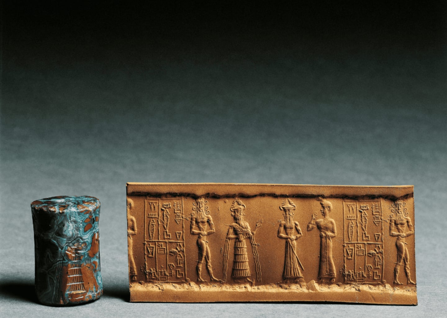 Adding official seals to important documents was one of the first steps beyond using just names to verify identity. Dating back to ancient Mesopotamia, cylinder seals were rolled across clay tablets as a signature for official contracts or receipts of sale. These seals were personalized to support the identity of each owner. During the Old Babylonian period (2000-1600 B.C.E.), seals typically contained the individual's name and their father's name, along with the name of the god the person worshiped. An example found on an envelope from the city of Ur reads: "Waqrum/son of Shamash-naṣir/servant of Nimintabba."