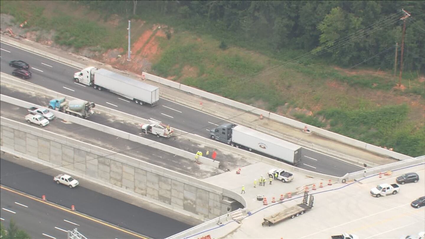 Officials closed the southbound lanes of I-77 near Sam Furr and Gilead roads around 11 a.m. after a concrete truck backed into one of the lines inside a construction zone and knocked it down.