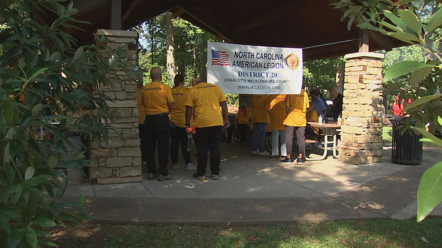 Around 50 people with the organization divided into groups to clean two markers at Freedom Park dedicated to Mecklenburg County’s World War II veterans.