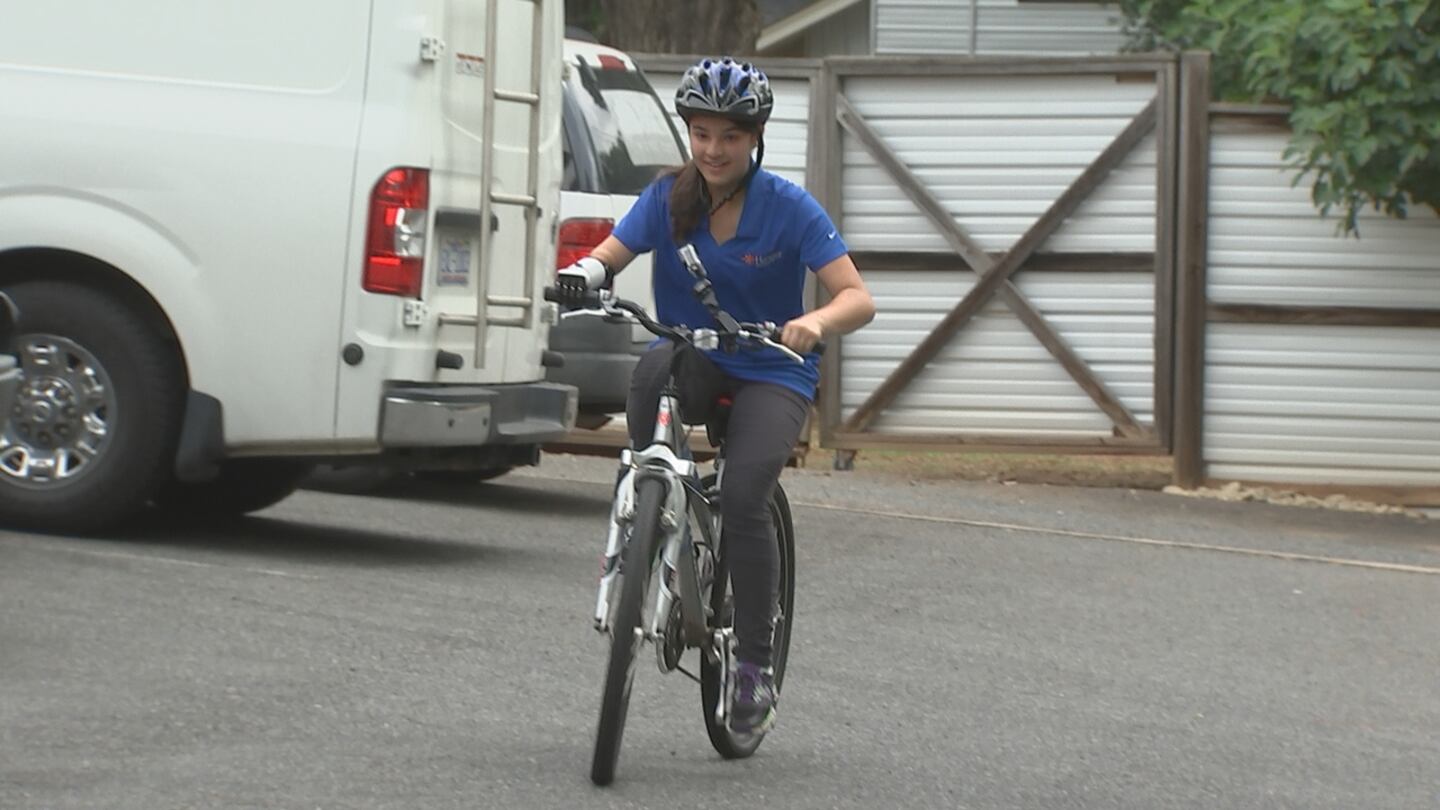 She said she used to ride her bike using one hand and an elbow. Her arm now allows her to put both hands on the handlebars.