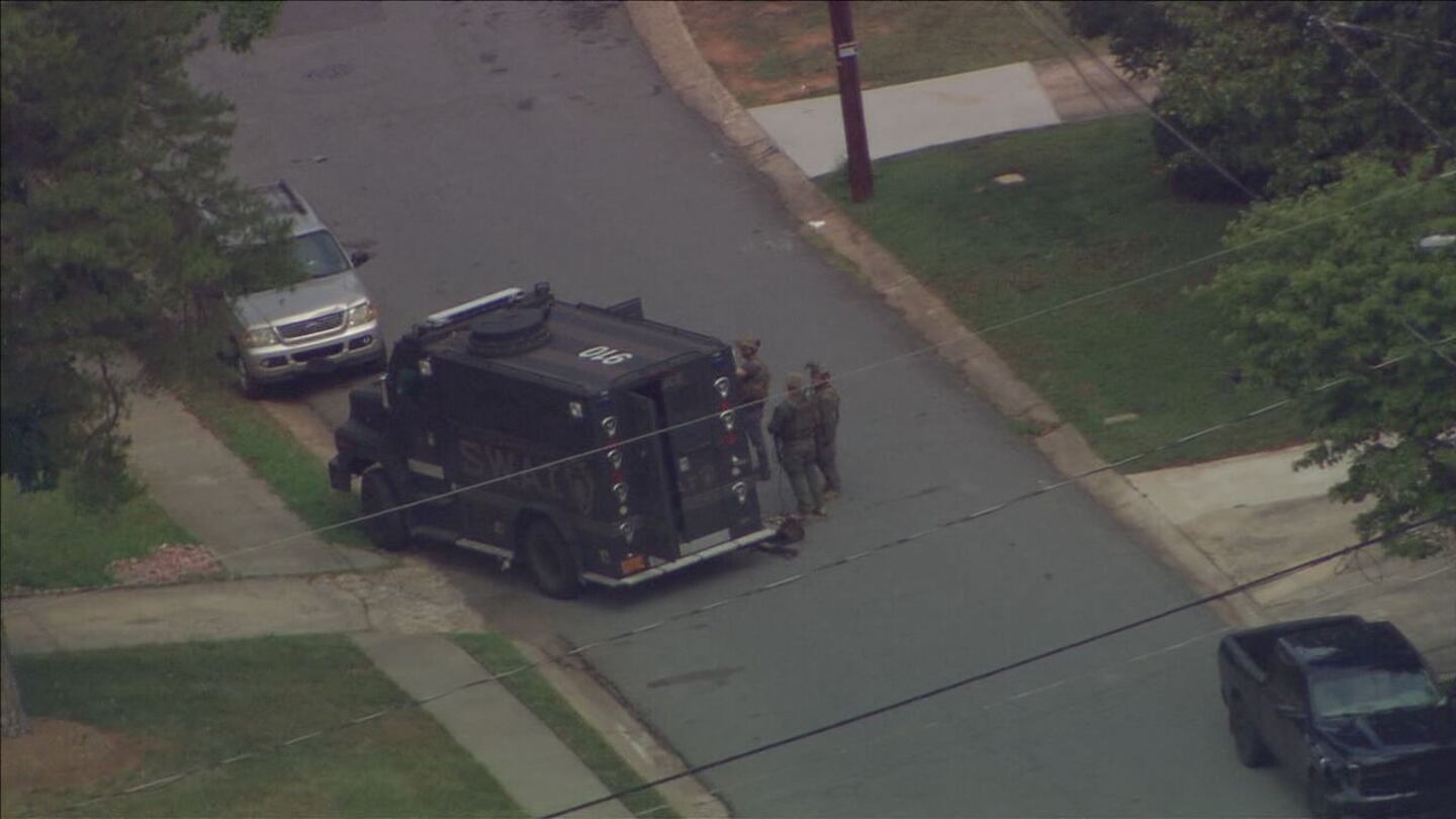 CHARLOTTE — Chopper 9 Skyzoom flew over a large police presence in northeast Charlotte Tuesday morning, where sources told Channel 9 that a person of interest was identified in connection with a shooting earlier in the day.